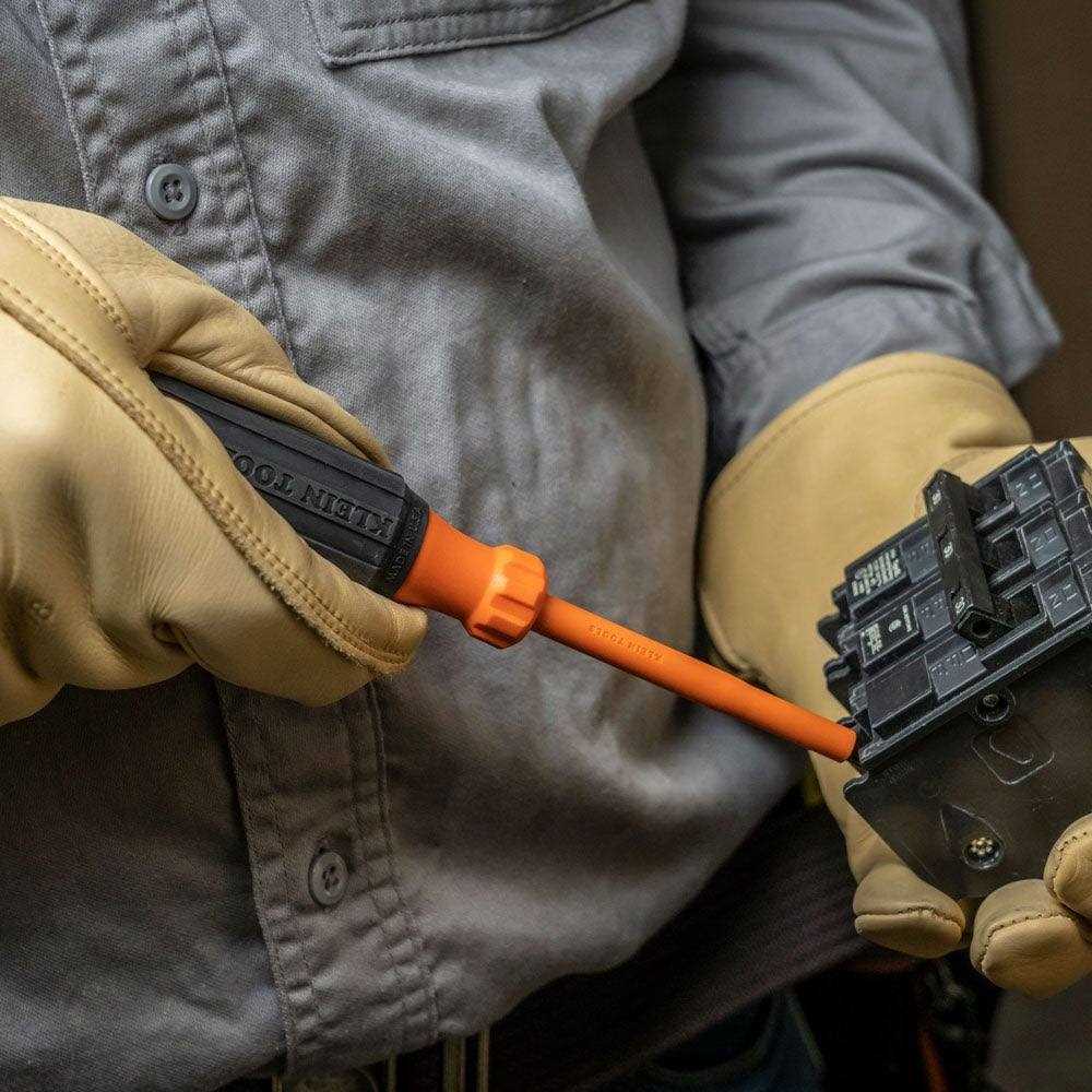 Klein Tools’ Insulated Screwdrivers feature a bright orange coating of flame and impact resistant insulation to protect against electrical shock. These tools exceed the ASTM F1505 standards for insulated tools, and are clearly marked with the official 1000V rating symbol. The tether hole in the handle provides added safety when working at height. Available in 4-Inch and 6-Inch round shanks with a variety of tips.WARNING Only use tools that are marked with the official international 1000-volt rating symbol shown above, if there is any chance that the tools will make contact with an energized source. Whenever possible, always de-energize lines and equipment prior to working on or around them. Always inspect your tools before use. Always inspect your tools before use. Keep tool clean, dry and free of any surface contaminants.