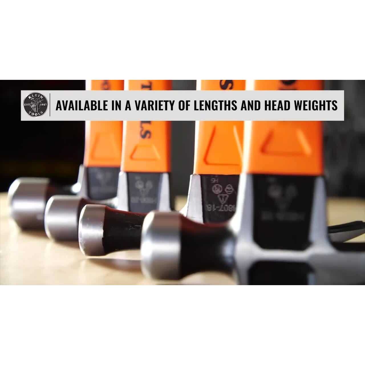Klein’s Straight-Claw hammer is made of high-strength fiberglass for optimal shock absorption. The durable handle features a non-slip grip for comfort and a hang hole for tethering ability or hanging storage.WARNING Always wear approved eye protection. Never use on or near live electrical circuits. Do not strike hammer faces together. Do not strike hammer faces together.