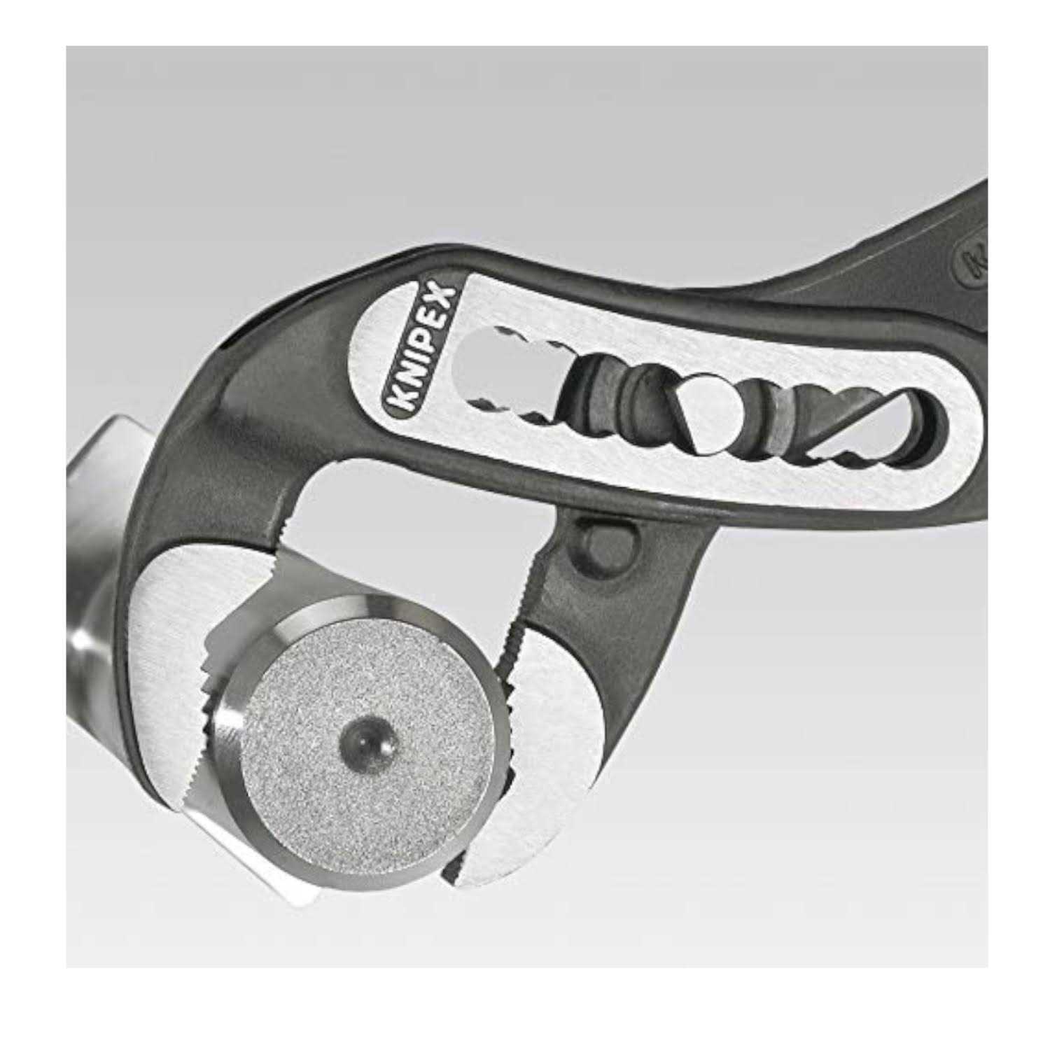 Providing more output and comfort compared to conventional water pump pliers of the same length, the KNIPEX Tools Alligator water pump pliers offers nine adjustment positions for 30 percent more gripping capacity and good access to the workpiece due to the slim size in its head and joint areas. It’s so versatile, it can be used in any industry — automotive, electrical, HVACR, industrial, and even for DIY. A serrated gripping surface on the jaws allows for gripping any shaped object — round, square, hex, or flat. Plus, the tool’s teeth are induction hardened for wear resistance and a longer life. A box joint provides directional stability when working in any environment. This dual channel design offers the operator increased confidence that the tool will not bend or break under heavy duty working conditions. A fine adjustment enables you to find the perfect setting for different sized workpieces. By adjusting the handles to get the appropriate width, you can lock the jaws into place to avoid slipping off the workpiece. Once locked into position, you won’t have to squeeze the handles to get a greater grip. Only downward pressure on the top handle is needed to firmly hold the object. The Alligator also has a forged on pinch guard that prevents the operator’s fingers and hands from being pinched. Because the guard is forged at the same time that the tool is made, it will last as long as the tool itself.