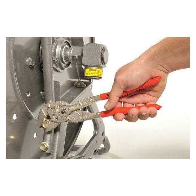 One-of-a kind tool that replaces a full set of inch and metric open end wrenches. Excellent for gripping, holding, pressing and bending applications. Smooth parallel gripping jaw prevents marring on work surfaces. Adjustment at the touch of a button. Zero backlash contact pressure – no damage to edges. Has 22 adjustment positions to adjust to hex nuts up to 2 3/8 .