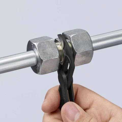 The KNIPEX Cobra XS is the smallest water pump plier in the world with full functional capability. It grips like a big tool, but its compact design and slim head provide firm grip even in tight spaces. It has one-handed quick adjustment for fitting various workpiece sizes. It also self-locks on pipes and nuts, grips surfaces with special hardened teeth, and features a pinch guard which prevents operators’ fingers from being pinched.