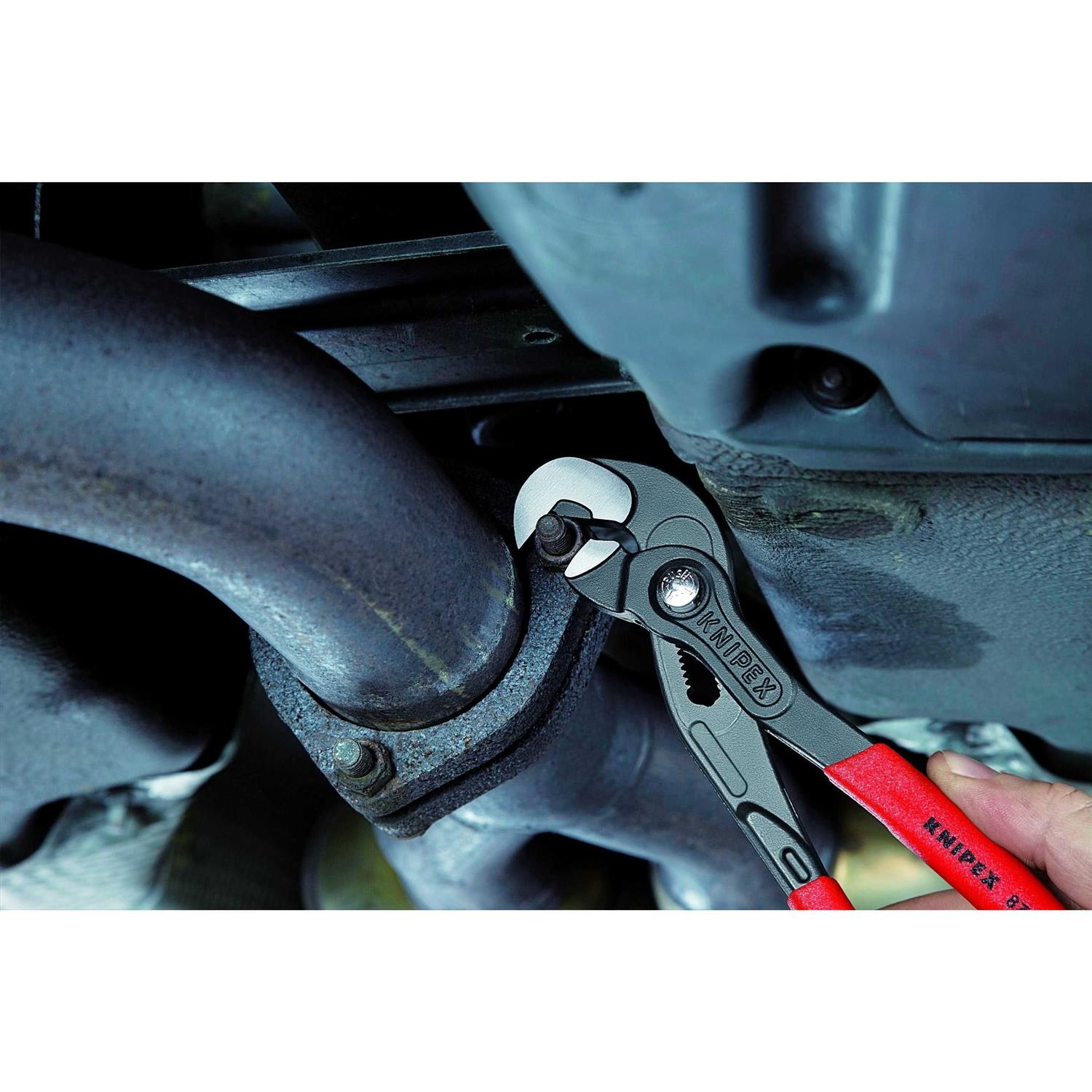 The KNIPEX 87 41 250 Tongue and Groove Pliers are the go-to tool for tough jobs. You can rely on its excellent quality to last through years of use. Made with chrome vanadium electric steel, this plier is extremely durable and reliable. It has a black atramentized finish, polished head, and plastic coated handles. The straight jaw offers a 1 1/4 in. wide opening for gripping various shapes and sizes of objects. The push button adjustment makes it easy to open or close the jaws with just one hand. This 10 in. long plier also has dipped handles that provide an extra firm grip when working with small parts or hard to reach areas. The KNIPEX 87 41 250 Tongue & Groove Pliers are the professional grade tools you need to get any job done right.