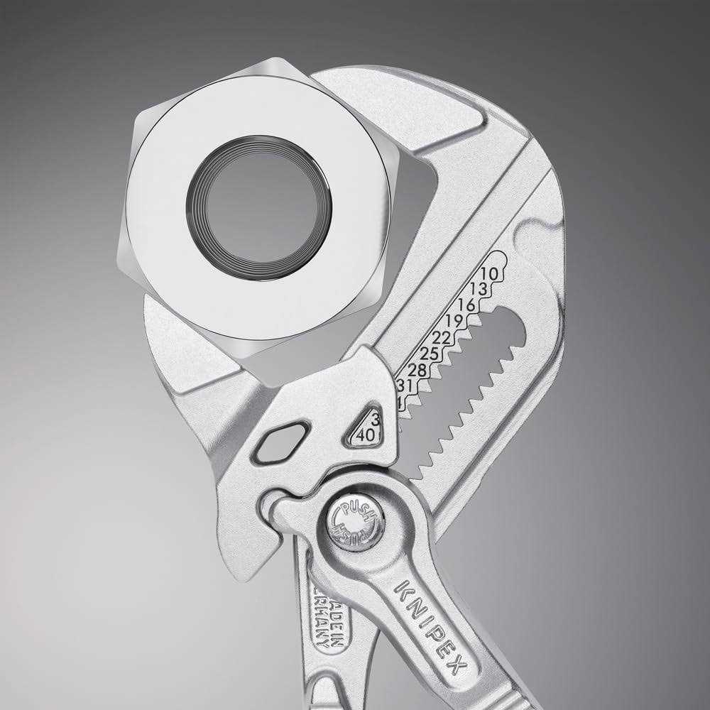 Knipex 9K 00 80 121 US features pliers wrench models 86 03 125 and 86 03 180. The 86 03 125 is 5-inches long with 11 adjustment positions, making it a mini yet mighty tool. It is ideal for every-day-carry (EDC) kits and also for precision mechanics and access to confined spaces. The 86 03 180 is 7 1/4-inches long with 13 adjustment positions and features narrow gripping jaws for fastening/loosening situations that require a slim tool. The 86 03 125 has capacity for nuts up to 7/8-inch and the 86 03 180 has capacity for nuts up to 1 3/8-inch.