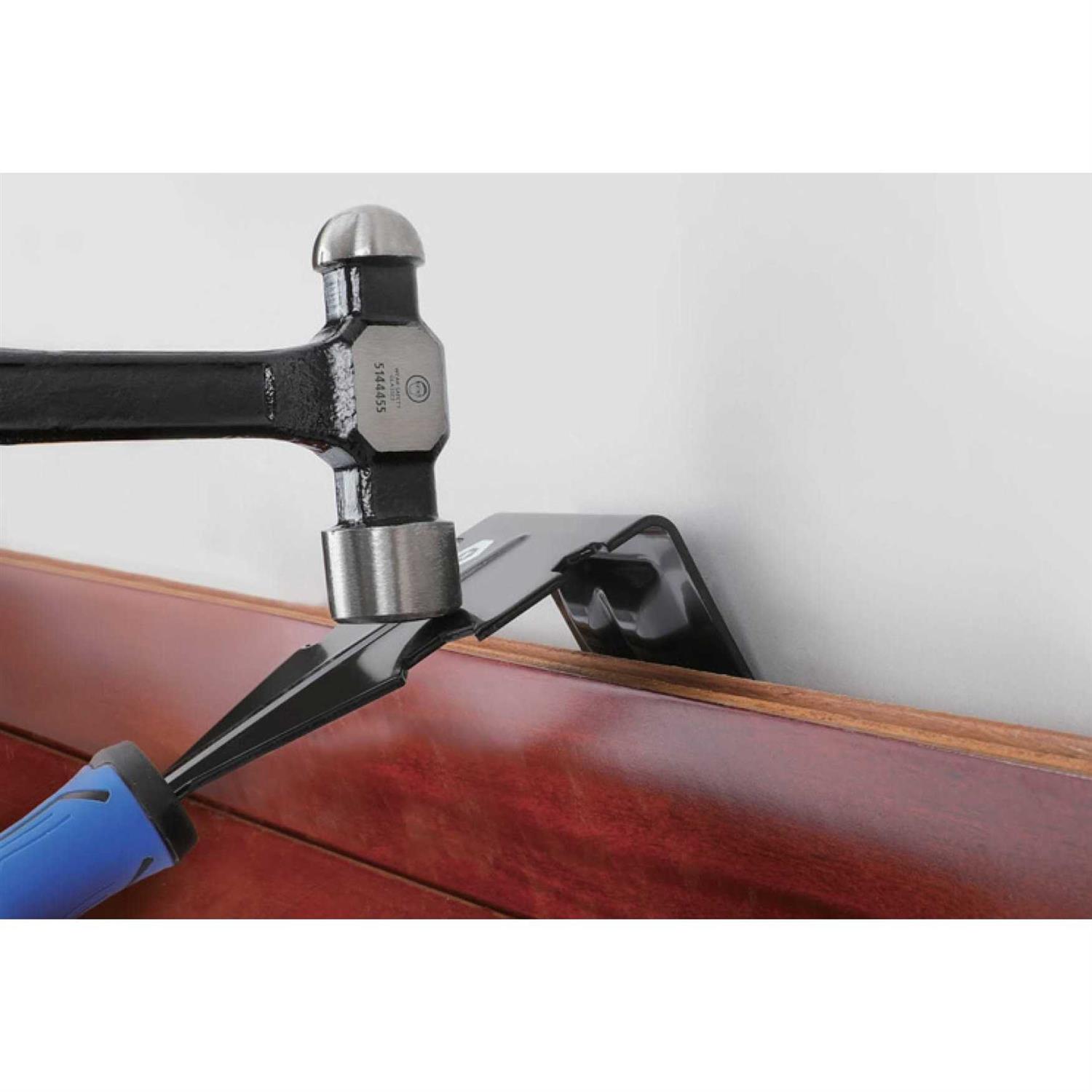 Made from durable, heat-treated steel Large contact area distributes force and will not put a hole in your drywall Wedge center for easy extraction of trim and baseboards Use to remove tile, flooring and other materials, no shim or board spacer needed. Twisting action works best, use a hammer to drive the Trim Puller downward between the trim and wall. Hangable Hand Multi-function Home Improvement Wood Tile Flooring Trim Molding Removal Tool 11-in Metal Moulding Pry Bar