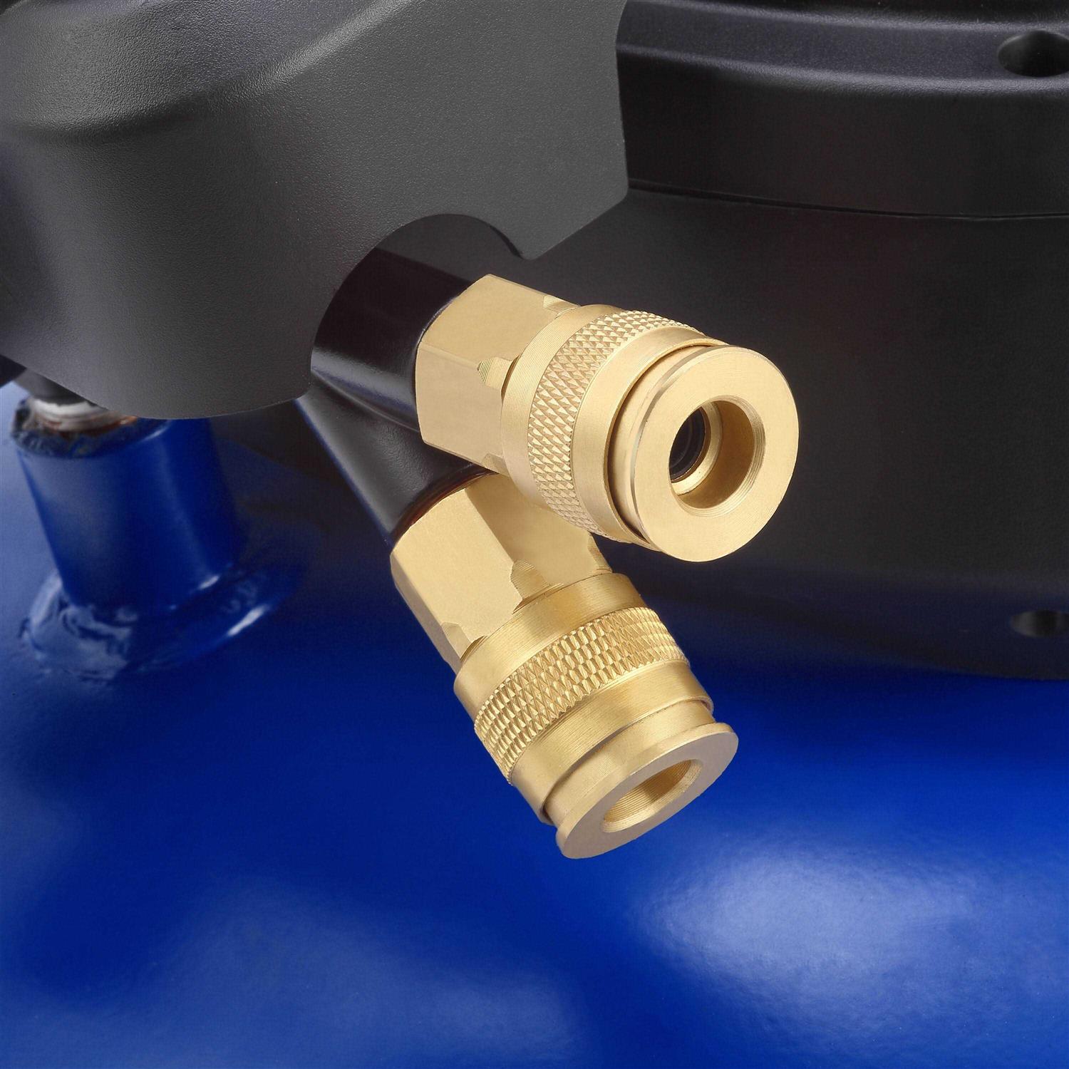 Powerful oil free universal motor requires maintenance free and easy to get started in low voltage with extension cord. Two durable quick couplers allow two tools are used simultaneously. Two gauges provides pressure indicator for both tank and tool to be used. 1/4-turn ball valve makes it easy to drain the tank anytime without blocking.