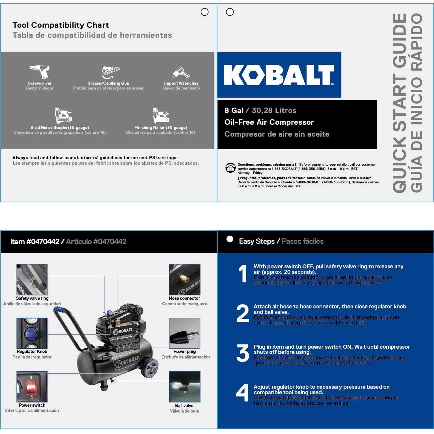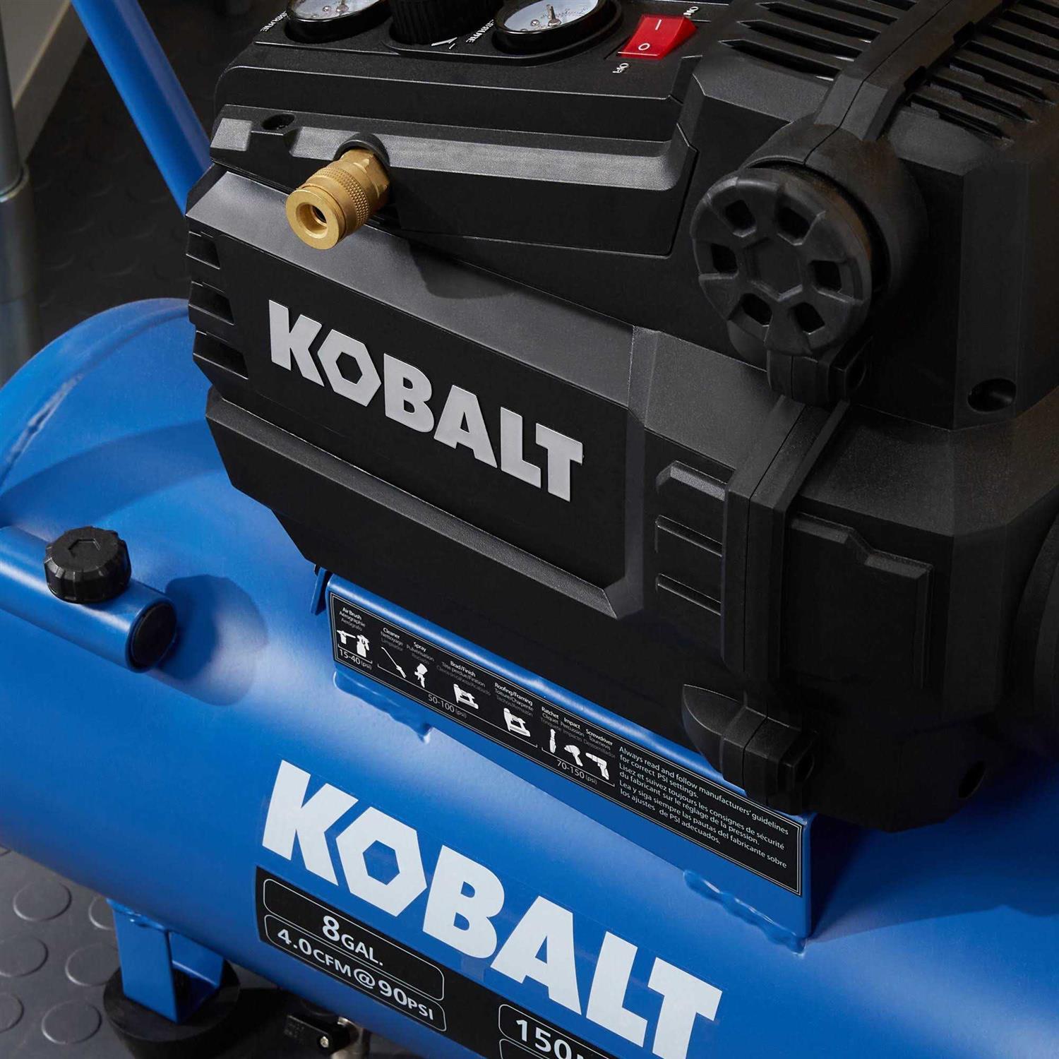 Kobalt 8-gal 150-PSI portable electric air compressor is perfect for use with a variety of air tools. 120-Volt 1. 8-HP induction motor provides extended life. Oil-free pump requires less maintenance for your convenience. Control panel with 2-in steel case gauges regulator and brass quick coupler offer easy access and operation. Horizontal tank design with fully-shrouded pump and motor helps reduce noise and protect from damage. Removable handle and rubber wheels provide easy mobility and storage. 6-ft power cord can be wrapped around handle for convenient storage. Lever handle ball valve allows for easy draining and maintenance. Perfect for use with a variety of air tool items.