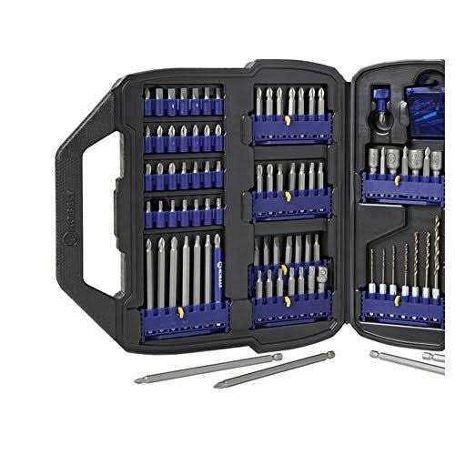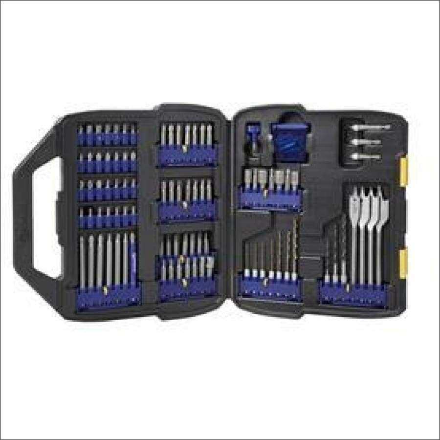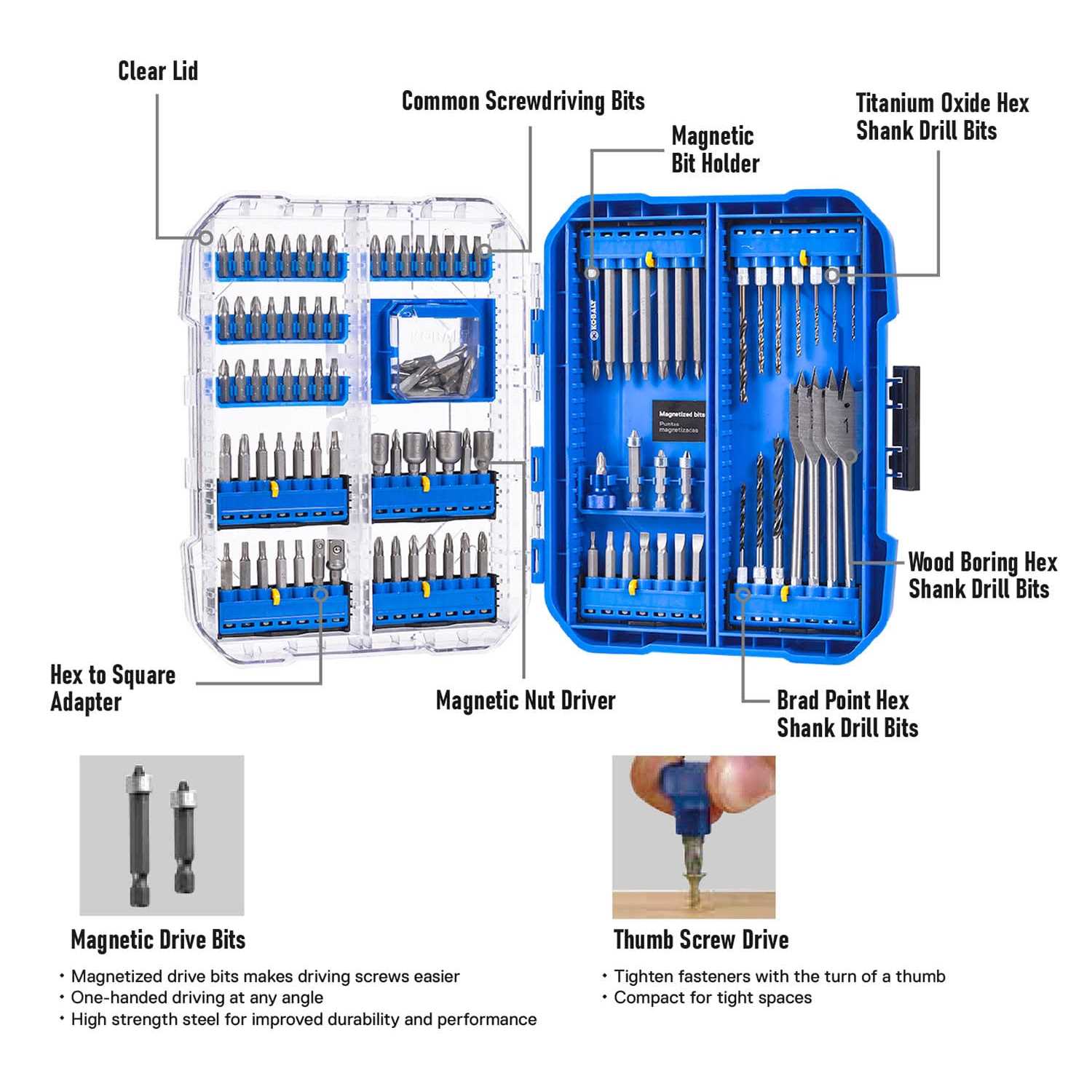 Includes 6 3-12-in power bits 29 2-in power bits 46 1-in insert bits 7 HSS hex shank drill bits 3 hex shank brad point drill bits 4 hex shank spade bits. 2 Hex-to-square adapters 4 magnetic nut setters 1 thumb driver 1 magnetic bit holder and 3 patented mag bits. Magnetic collar keeps screws in place and provides one handed driving at any angel. Hard case provides storage and organization.