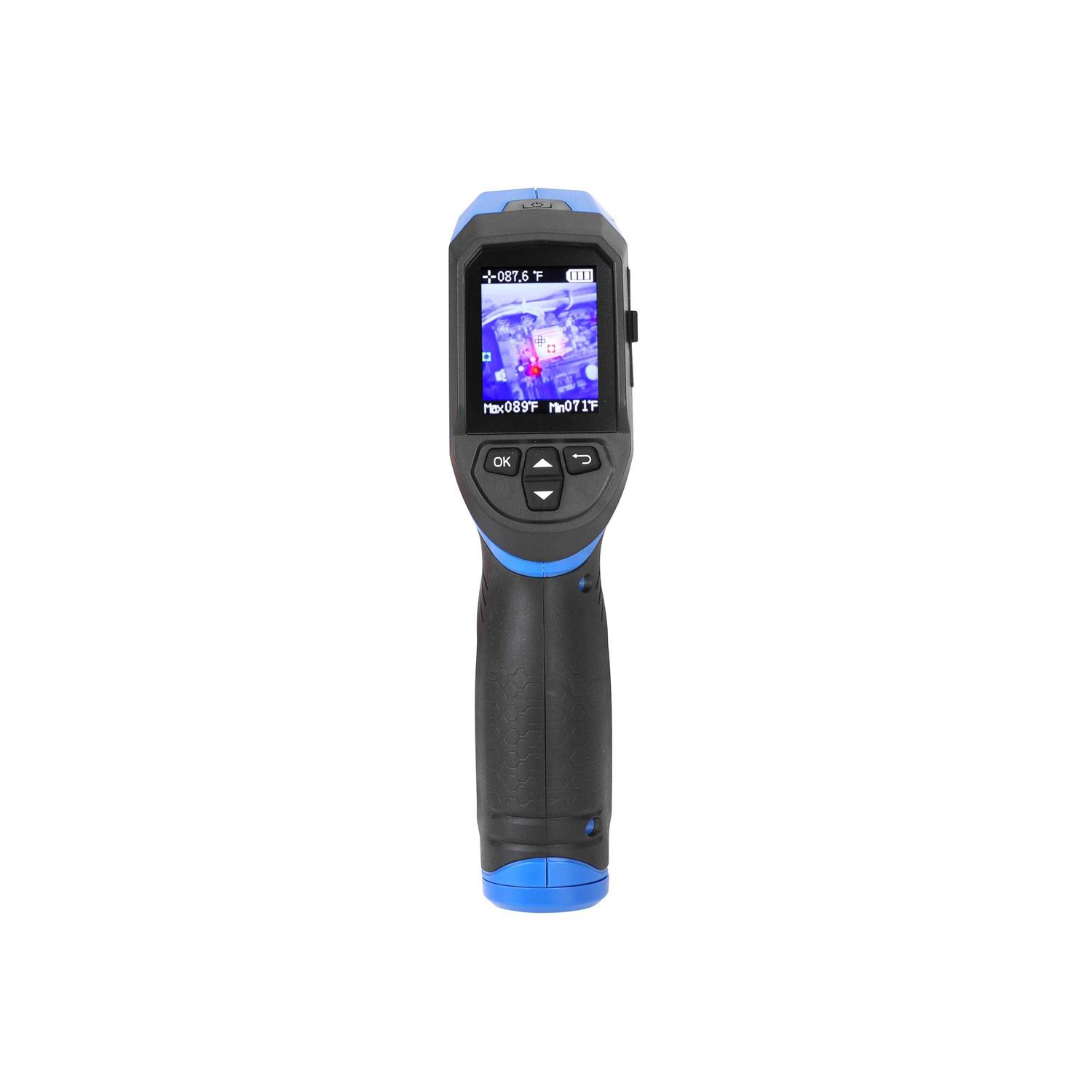 Not intended for testing human temperature. Quickly identify automotive heat-related problems, electrical connections, motors, HVAC and electrical, insulations leaks and more. Easy-to-read backlit LCD screen. High and low point temperature measurements. Five levels of visual and thermal image blending. Selectable color palettes. Switchable between Celsius and Fahrenheit. Adjustable emissivity. Auto power off function.
