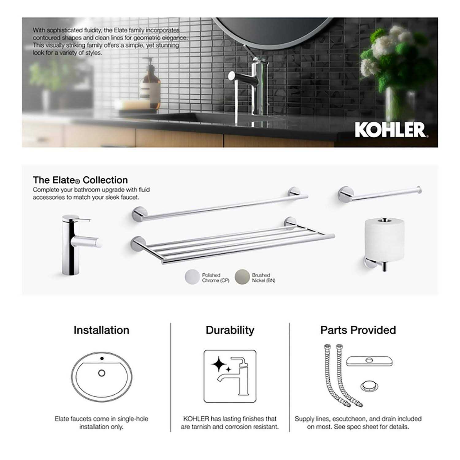 Dimensions: 4.19L x 1.81W x 6.56H in. Constructed from premium metal. Versatile chrome finish is tarnish- and corrosion-resistant. Single hole sink design. Ceramic disc valve. ADA compliant. Flow rate: 1.2 gpm. Includes 1 handle. Includes a high-temperature limit setting. Infuse a modern aesthetic into your bathroom space with the Kohler Elate Single-Handle Bathroom Sink Faucet. This sleek sink faucet is fashioned for single-hole installations and is ADA compliant. Its ceramic disc valve is designed with leakproof protection. A single lever allows for convenient on-off operation and temperature control. This faucet is constructed from durable metal and comes with a gleaming chrome finish. Color: chrome/metal – K99491-4-CP.