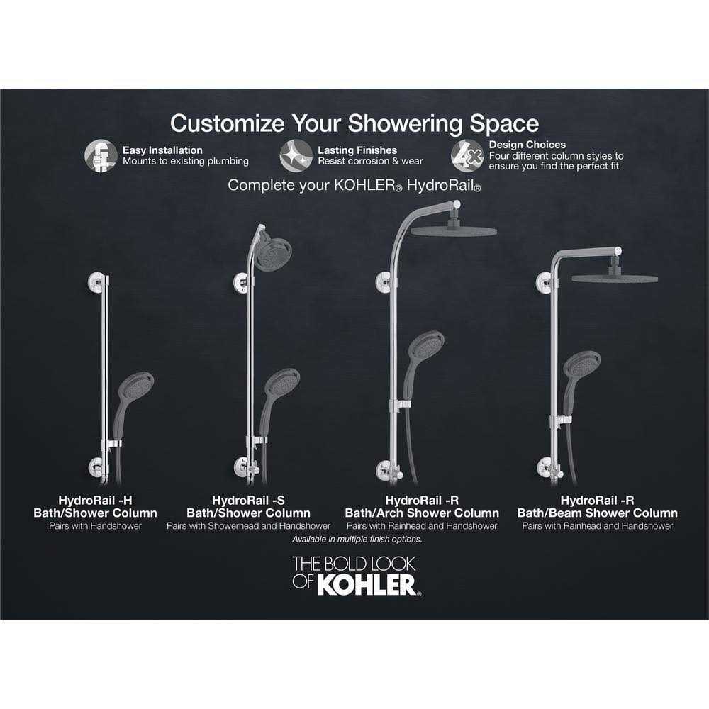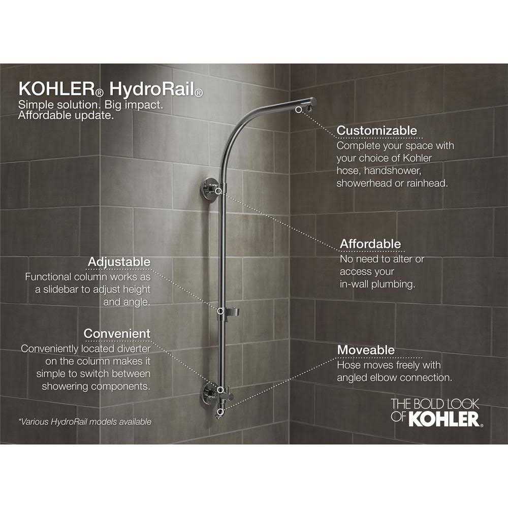 HydroRail-R allows you to easily upgrade a standard shower to a spa-like showering experience with luxurious overhead rain and handshower functionality. It’s designed to accommodate a wide array of shower configurations without altering in-wall plumbing, making it suitable for both remodels and new construction. This shower column converts your single-outlet showerhead into a two-outlet custom showering experience, and has a slidebar bracket for easy height and angle adjustments to your handshower. For smooth toggling between handshower and rainhead functions, this column features a diverter conveniently located at the base. FEATURES Column lets you customize your shower with a showerhead and handshower. Beam shower arm makes it possible to install with extra low ceiling heights. Slidebar bracket allows you to adjust height and angle of the handshower. Diverter at the base of the column makes for easy toggling between handshower and showerhead. Developed and optimized for use with KOHLER handshowers and KOHLER Katalyst showerheads. Rainhead, handshower, and hose sold separately to allow for customized components. Material KOHLER finishes resist corrosion and tarnishing. Premium metal construction for durability and reliability. Installation Wall-mount shower only installation. Installs in less than 60 minutes without changes to in-wall plumbing (subject to condition of existing installation). Includes an adapter that will fit with most installations but may require 1194630, 1187917, or 1194302.