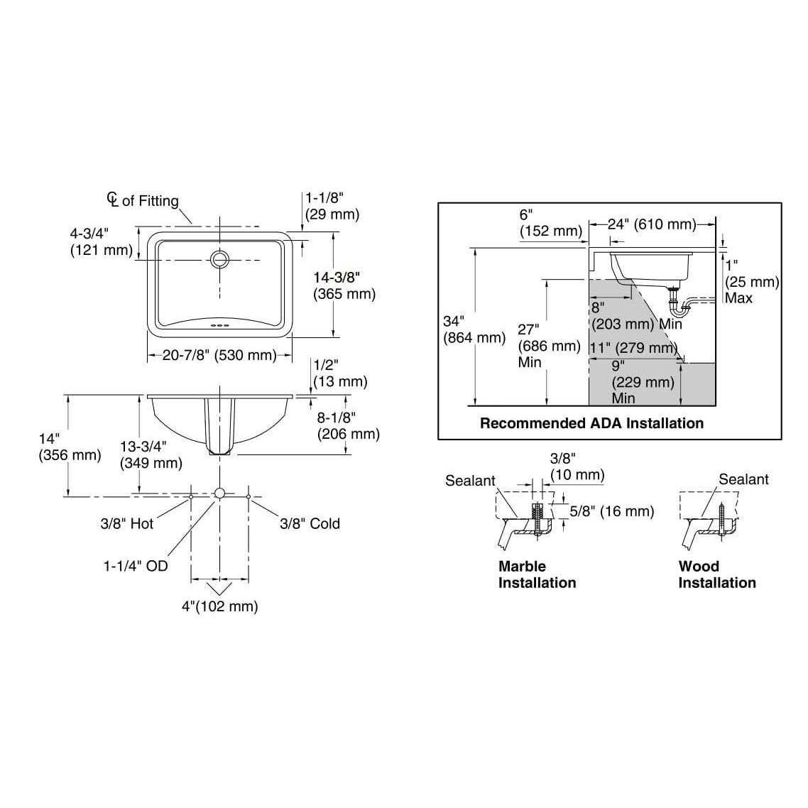- NOTE: ADA-compliant when installed in a 24″ minimum depth countertop.
