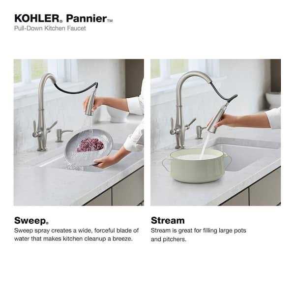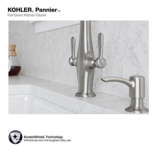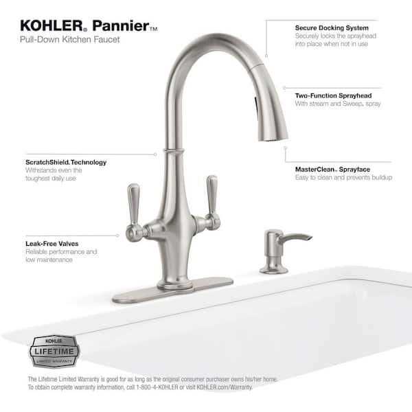 The Pannier kitchen sink faucet tastefully pays homage to the classical era while simplifying ornamentation and incorporating modern conveniences. A high-arch spout offers vertical clearance for tall cookware and pitchers, the retractable spray head makes sink cleanup easy, and two handles give you positive temperature control. Elevate your experience with KOHLER. Premium metal construction for durability and reliability High-arch spout offers vertical clearance for tall cookware and pitchers Box includes: assembled faucet, supply lines, escutcheon plate, soap/lotion dispenser Longer shank works with countertops up to 2-1/2 in. thick and is easy to install Flexible supply lines and quick-connect fittings simplify installation KOHLER ceramic disc valves exceed industry longevity standards for a lifetime of durable performance 2-lever handles offer separate control of hot and cold water 1.5 GPM (5.7 LPM) maximum flow rate at 60 psi (4.14 bar) 2-function pull-down spray head allows you to switch from aerated stream to sweep spray MasterClean sprayface features an easy-to-clean surface that withstands mineral buildup ProMotion technology’s light, quiet braided hose and swiveling ball joint make the pull-down spray head easier and more comfortable to use Sweep spray features specially angled nozzles that form a wide, powerful blade of water to sweep your dishes and sink clean