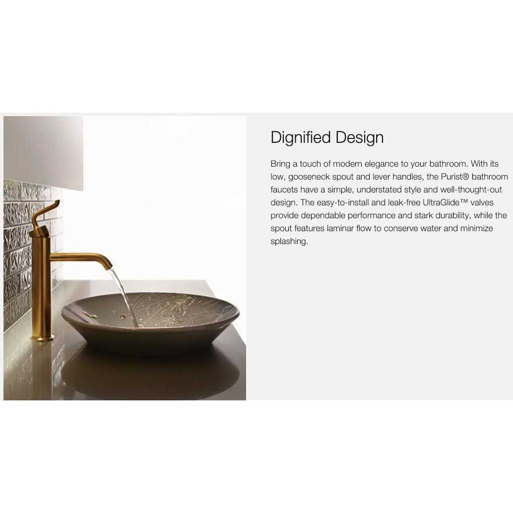 Capturing the style of minimalist design, Purist faucets deliver streamlined water control. This sink faucet trim features a 35-degree angled spout and cross handles for easy operation. The convenient wall-mount design provides a clutter-free countertop in your bath or powder room. When paired with a two-handle ceramic disc valve, this trim offers optimal performance. Combine it with bath accessories from the Purist collection for a distinctively modern and unified decor.