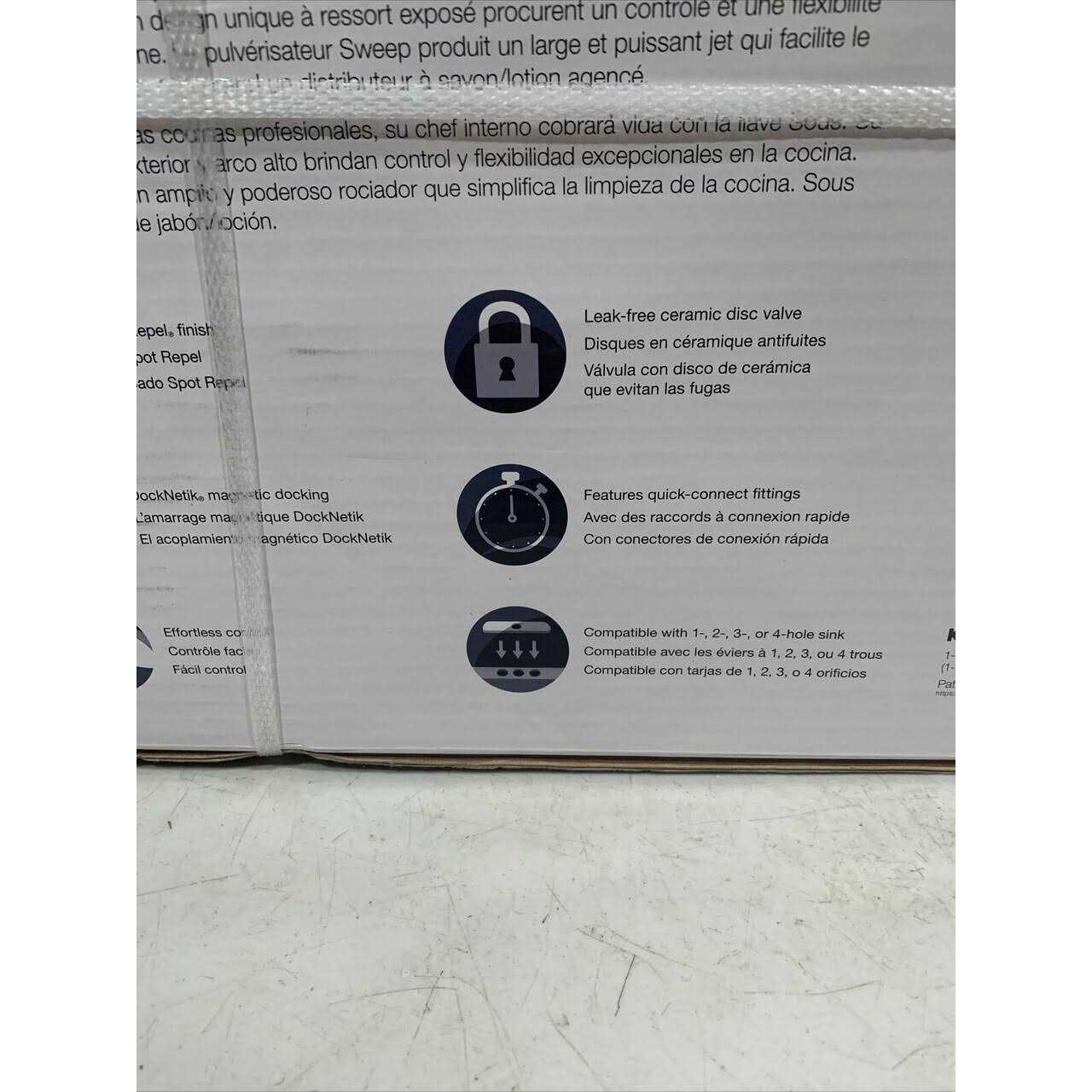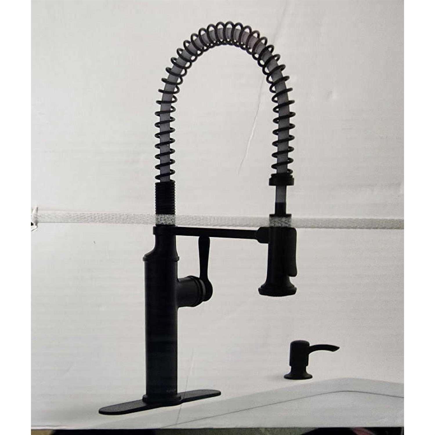 A high-arch spout with exposed spring provides outstanding range, flexibility and control for every task, from food prep to filling pots to cleanup. Switch from stream to powerful Sweep spray with a quick touch of the spray head button. This faucet includes a soap/lotion dispenser.