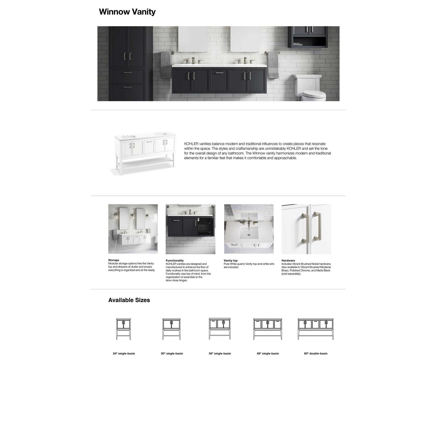 Customize your Winnow cabinet with upgraded hardware finishes of the classic, simply designed 5″ door and drawer pulls. The expanded handle selection offers personalization, while coordinating with other bathroom accents.