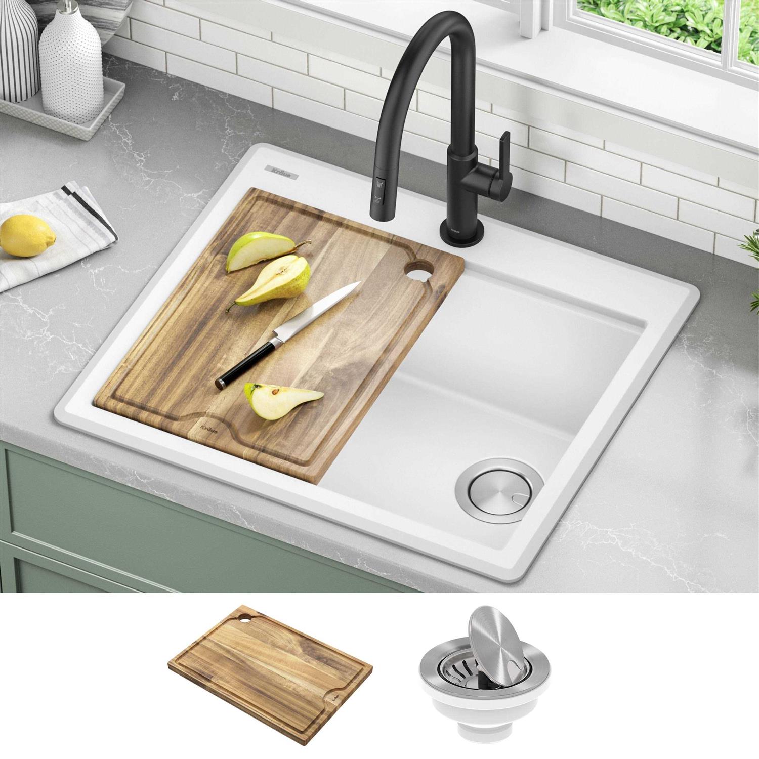 Kraus 25 In. Bellucci Granite Composite Workstation Drop-In Top Mount Single Bowl Kitchen Sink with Accessories KGTW12-25WH