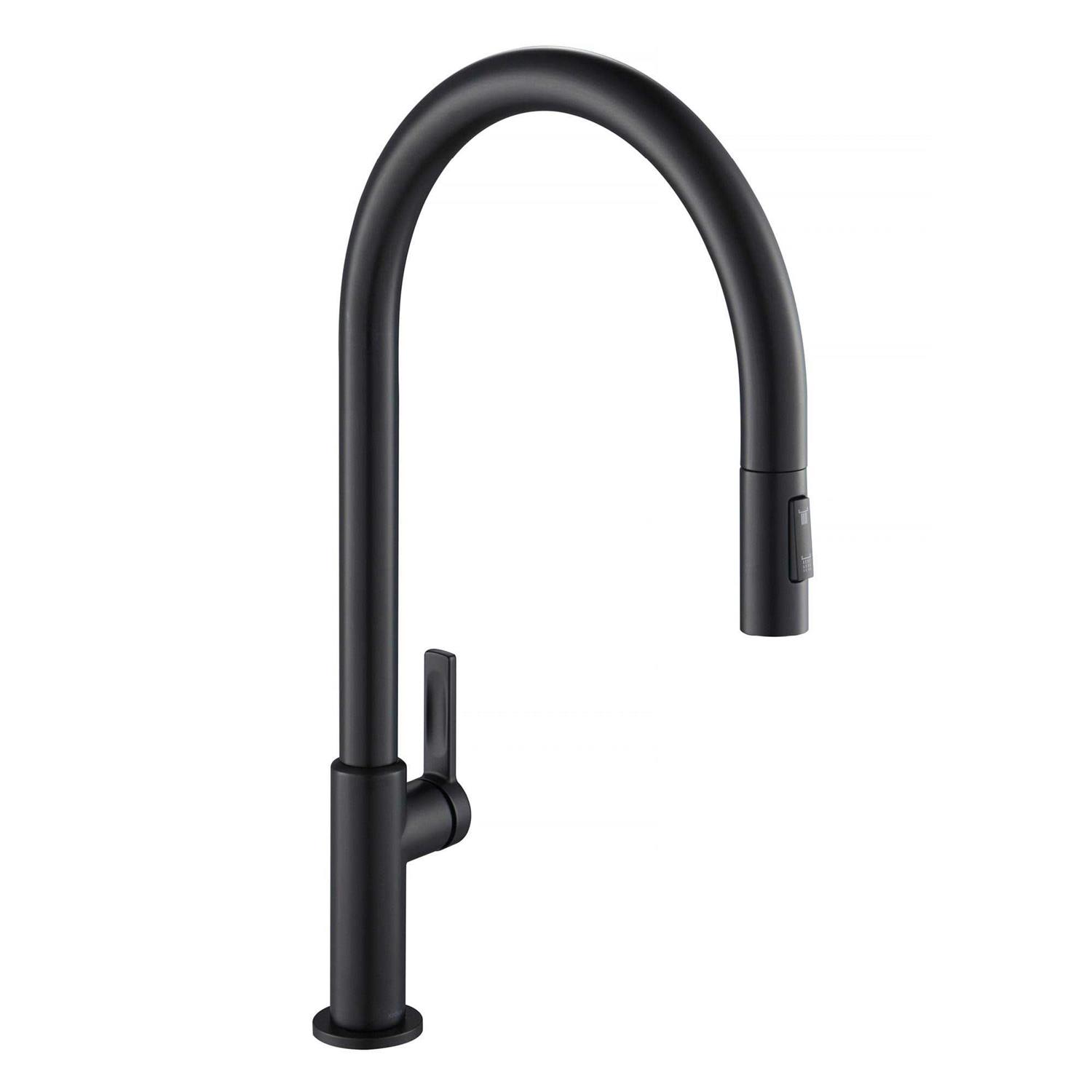 The streamlined and elegant Oletto Pull-Down Faucet features a distinctively modern design with universal appeal. Every design detail is carefully thought through to create a perfectly balanced silhouette that enhances any kitchen or laundry room. The impressively tall high-arc spout becomes an instant focal point in larger kitchens and will elevate the style of any type of kitchen sink. The added height of the extra-tall spout offers ample room under the faucet for oversized items. Designed for ease of use the ergonomic comfort-grip handle operates with 90 forward rotation allowing for smooth operation as well as installation flexibility in spaces with limited backsplash clearance. A pull-down sprayhead with swivel adapter provides maximum maneuverability with ultra-smooth retraction and secure docking so you can flex pivot and reach all around the sink. The robust design features lead-free solid brass construction and state-of-the-art components including a ceramic cartridge engineered to last twice as long as the industry standard to ensure a lifetime of worry-free use. Installation is simple and convenient with flexible pre-attached water lines QuickWeight snap-on counterweight and easy-install QuickConnect sprayer hose that snaps together for a leak-free connection. To personalize the look choose from a variety of durable and corrosion-resistant finishes that are designed to protect your faucet over a lifetime of use including proprietary Spot Free Finishes that make an ideal choice for busy kitchens. This faucet pairs perfectly with all KRAUS Workstation Sinks for superior functionality and professional style. Features. Elegant And Ergonomic Design. Wear-resistant Finish. High-arc Spout. Dual-function. Comfort-grip Handle. Easy-clean Nozzles. Built To Last With Lead-free Solid Brass Construction And Premium Components For A Lifetime Of Use. Premium Ceramic Cartridge Tested Over 500000 Cycles To Ensure Long-lasting Leak-free Use. Installation-ready. Single Hole Installation Allows You To Install This Faucet With Any Kitchen SinkSpecifications. Finish: Matte Black. Material: Brass. Spout Type: High Arc. Sprayer Head Functionality: Spray and Stream. Spout Height: 10.5. Spout Reach: 10.88. Overall Height: 20.38. Weight: 8.36 lbs.