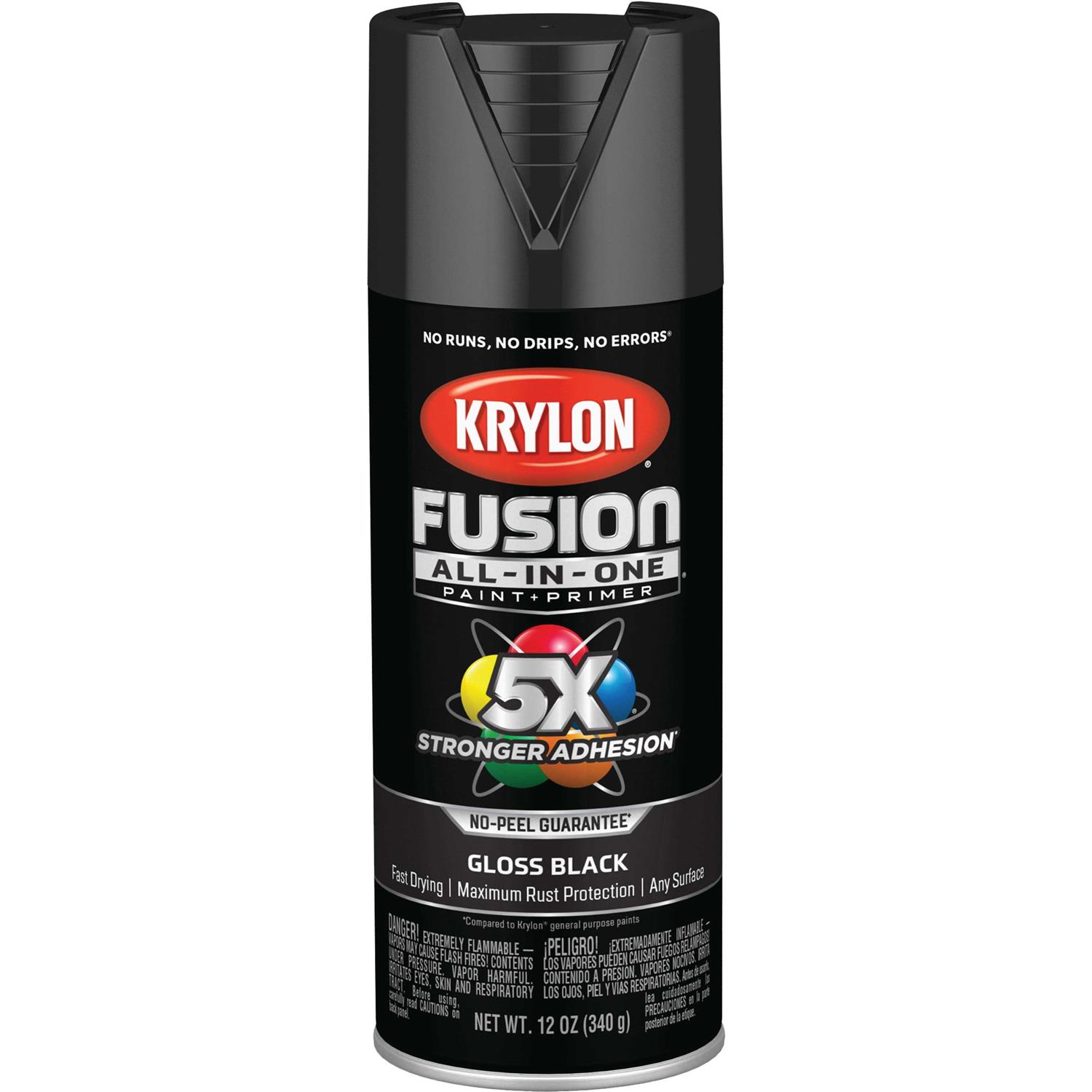 Krylon Fusion All-in-one Enamel-paint Black-Color 12-OZ Gloss Aerosol-Spray 12-OZ Bonds to difficult surfaces such as plastics and ready-to-assemble furniture without sanding or priming. Provides maximum rust protection for all outdoor projects and offers a broad color palette with multiple finishes and sheens for indoors and out. Superior adhesion and durability. No sanding or priming required.