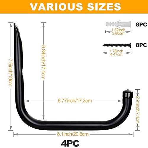 EXCELLENT LOAD-BEARING STRENGTH – our heavy duty ladder garage storage hooks are made of thicker carbon steel with a new bending method, which makes them strong enough to accomplish hanging tasks for heavy objects without bending. This allows them to be used in garages, workshops, and warehouses. PREMIUM MATERIALS – High-quality materials are used in the construction of these utility hooks, which include heavy-duty metal pieces made of high-strength carbon steel. The surface of these hooks has been coated with plastic that has been sprayed on, which makes them very resistant to rust and corrosion. WIDE VARIETY OF USES – Heavy-duty large wall hooks are ideal for hanging a ladder, bike, chair, shovel, stroller, blower, and other objects found in garages, gardens, and homes. Not only do they help you save space in your home, but they also offer a wide variety of uses. EASY INSTALLATION – Installing these garage storage hangers is as simple as turning the screw end against the wood and then tightening it until it is snug on the board. This makes installing garage storage hangers a breeze. It is necessary to pre-drill holes and use anchors when installing shelves on brick walls, concrete walls, or plasterboard walls. KURUI PROFESSIONAL HARDWARE SERIES br KURUI is a professional factory with years of experience in manufacturing daily hardware, tools and fasteners. br br KURUI 4PCS LARGE GARAGE HANGER KIT – Perfect choice for hanging heavy objects on walls, saving room for your house, garage, basement, storage rooms and garden. br br Reasons you should choose KURUI Heavy-Duty Wall Hooks br Premium Material with High Strength br Made of high-quality carbon steel with higher thickness, this garage wall hanger hooks are stronger, sturdier and of higher resistance to bending or breaking. br Highly Resistant to Rust & Corrosion br Finished with spraying plastic coating on the surface, these heavy-duty wall hanger hooks are rust proof and resistant to corrosions. br Easy installation & Wide Compatibility br You can easily mount these wall hanging hooks on wooden walls with screws and nuts, or onto brick walls, concrete walls, etc. with predrilled holes. They can also be installed on drywalls with anchors. br Wide Range of Applications br These high-strength carbon steel wall hanging hooks are perfect for heavy-duty hanging tasks in garages, basements, gardens, storage rooms and more, saving spaces and keep the room neat and tidy. br br PLEASE NOTE br – Please wear gloves to protect your hands while working. br – Please check the package content upon receiving. br br WHAT YOU GET br 4pc Ladder Hooks br 8pc Wood Screws br 8pc Wall Anchors