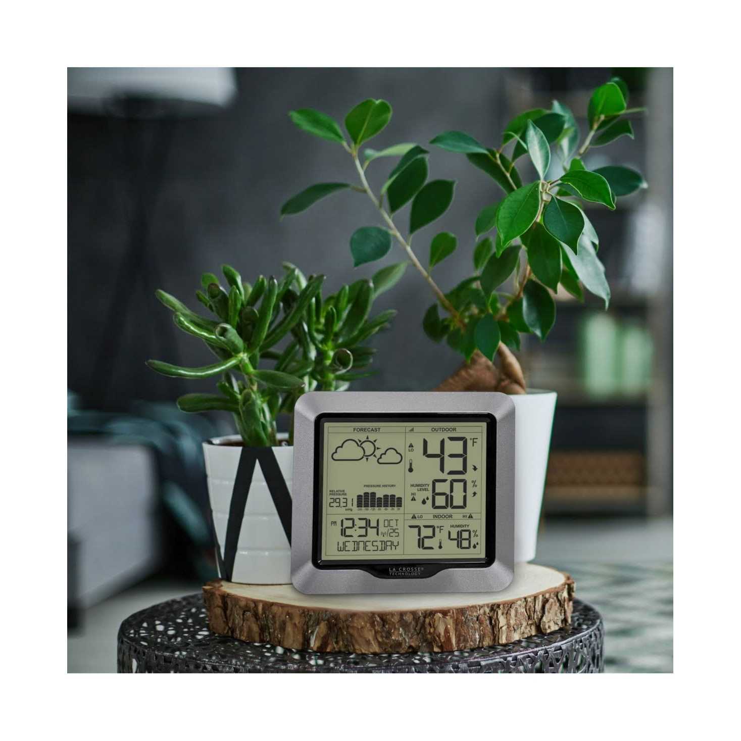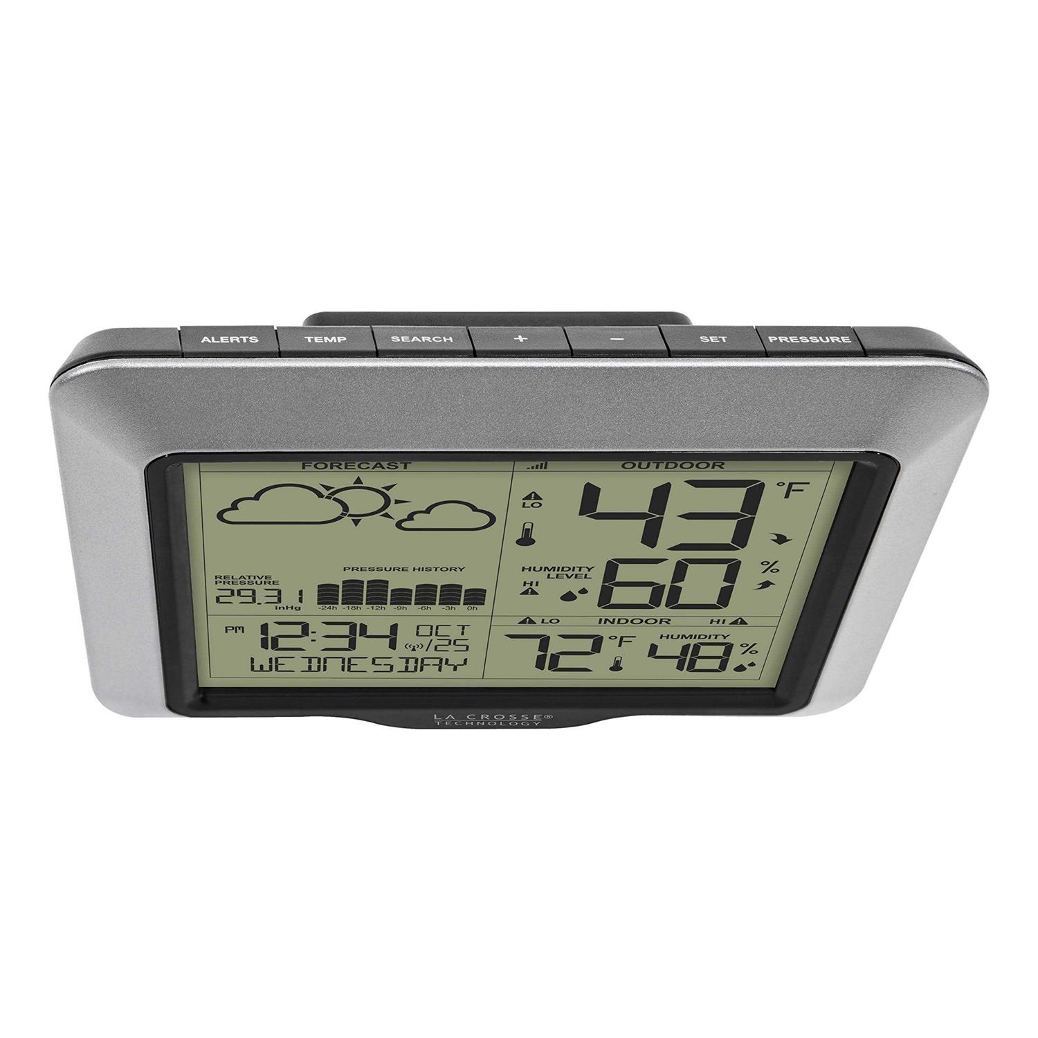 Complete backyard weather with fast reception and wireless technology. Easy-to-read LCD featuring future forecast and tendency, barometric pressure with graph, temperatures (F/C) and humidity (%RH.) Atomic self-set time and date and will automatically reset for Daylight savings time. Monitor backyard climate in a garage, storage room, or any other location with a transmitting sensor. A long-range of 330 feet and reads lower temp below -40F. Wireless capabilities with La Crosse Technology digital technology, it is portable to take with you practically anywhere!