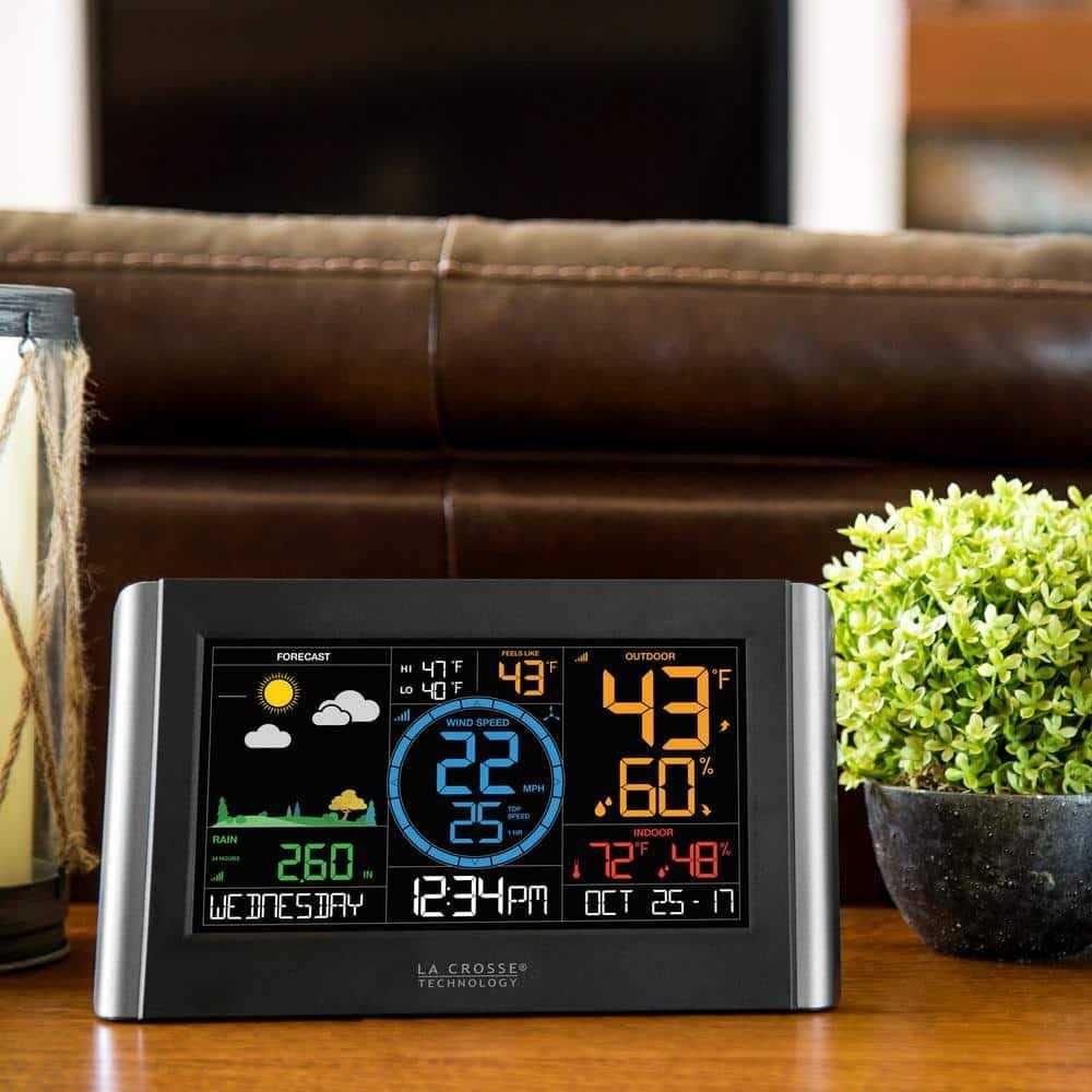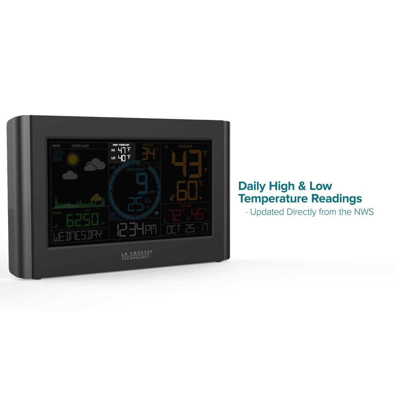 The Wireless Professional Weather Station from La Crosse Technology offers all the weather information you need to make sure Mother Natures unpredictability does not ruin your day. The dynamic color forecast icons, with changing seasonal foliage, shows what the weather is going to be like for the day. Along with your personal, up-to-the-minute wind, rain, and indoor/outdoor temperature and humidity, you know what is happening inside and outside your home, providing you the information to make the decision to adjust your thermostat, wear your jacket or even monitor rainfall to know when it is necessary to water your lawn. When Choosing to use the connectable feature, you now open your station to the enhanced features, which includes weather information from the NWS (National Weather Service) with detailed forecast information including the low and high temperatures of the day, change of precipitation as well as 8 additional forecast icons to keep you up to date to the weather to come.