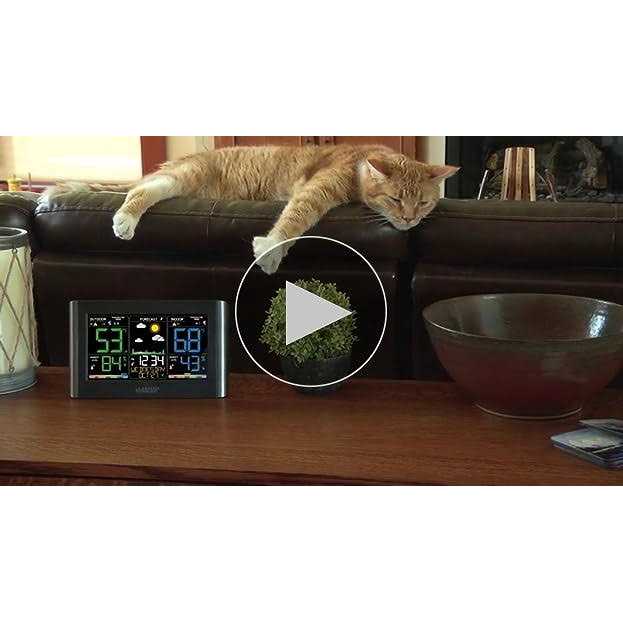 Get regular updates on local conditions with this Horizontal Color Wireless Weather Station by La Crosse ̈. Track all key weather data for your immediate area including indoor and outdoor temperature, humidity and comfort level with trend indicators. Animated forecast icons give you at-a-glance updates, and the atomic clock ensures accurate timekeeping. Easy-to-read icons keep you apprised of sensor transmission signal strength; battery power level for the station and sensor; and atomic time reception strength. The base can read up to three remote sensors (one included). The indoor display operates on the included AC power adaptor with three AAA batteries for backup. The remote sensor requires two AA batteries (no batteries included).