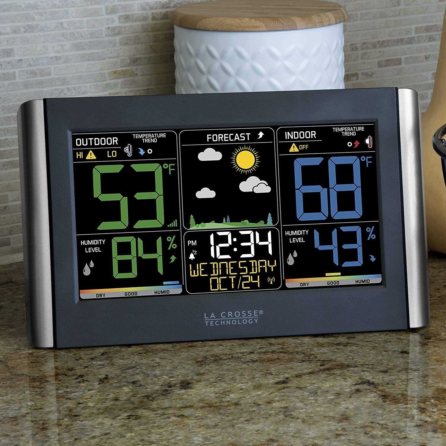 Full color display gives you current temperatures and humidity with a future forecast whether it could be sunny or rainy to snowy. Features accurate self-set atomic time and date with automatic DST updates. Records MIN/MAX values and alerts you of extreme temperatures. Also displays your heat index and dew point. Will indicate of weak or low battery and the signal reception strength.