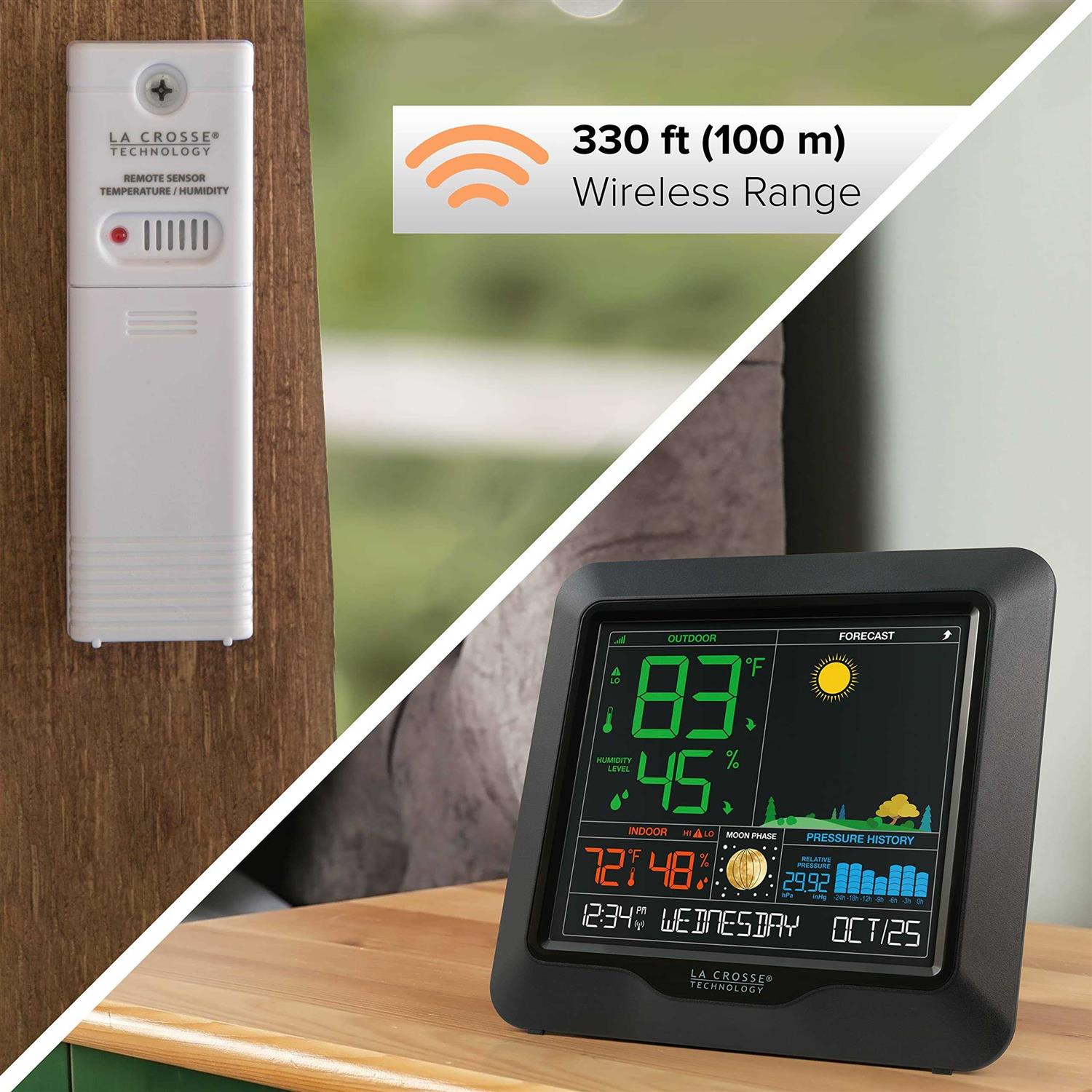 Appealing to all levels of weather enthusiast from the casual observer to the serious weather bug, the new basic Wireless Color Forecast Station from La Crosse Technology has advanced features unlike any other of its kind. e 300-foot sensor transmission provides flexibility in placement. With the newest feature set, you still have the ability to view indoor and outdoor temperature and humidity, the date which includes the full spelling of the day of the week, day and month, and time which sets itself using Atomic Time. Providing you with a sleek, modern design, this weather station is a perfect fit to any home or office décor. Forecast Faves Displays relative barometric pressure, numeric pressure history, a 24-hour pressure history graph, and moon phase with 8 different moon phase icons. Easy-To-Read The changing seasonal foliage and colorful forecast icons let you know in a glance what to expect. Portable Screen The bright colorful display can be hung on the wall or freestanding with a new and improved adjustable kickstand. Forecast Faves. Displays relative barometric pressure, numeric pressure history, a 24-hour pressure history graph, and moon phase with 8 different moon phase icons. Easy-To-Read. The changing seasonal foliage and colorful forecast icons let you know in a glance what to expect. Portable Screen. The bright colorful display can be hung on the wall or freestanding with a new and improved adjustable kickstand.
