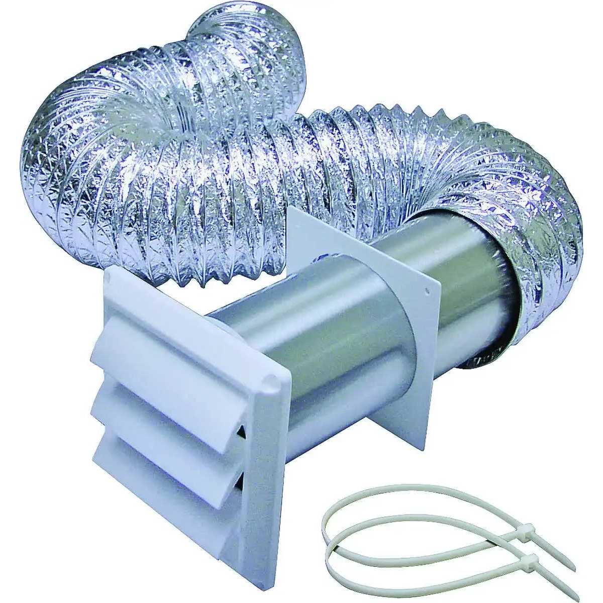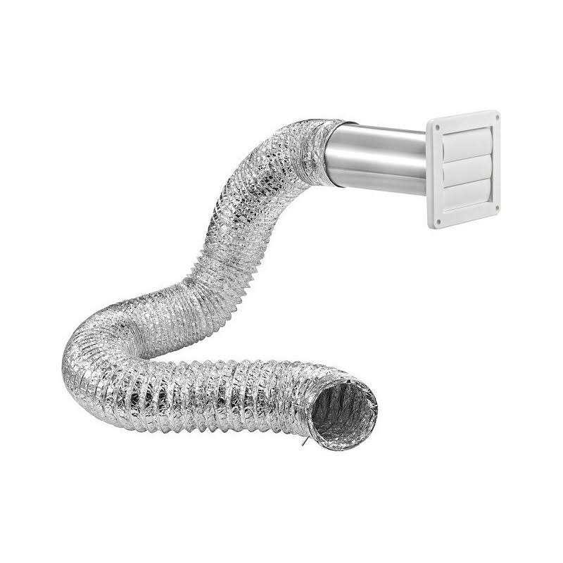 Includes (1) louvered vent with tail pipe, (1) UL listed laminated transition duct, (1) trim plate and (2) tension clamps. Opening/closing flaps prevents outside elements from entering the vent. Opening/closing flaps prevents outside elements from entering the vent. Flexible laminated foil design for easier installation. UV inhibitor is used to prevent the premature fading of vent. Louvers prevent outside elements from entering.