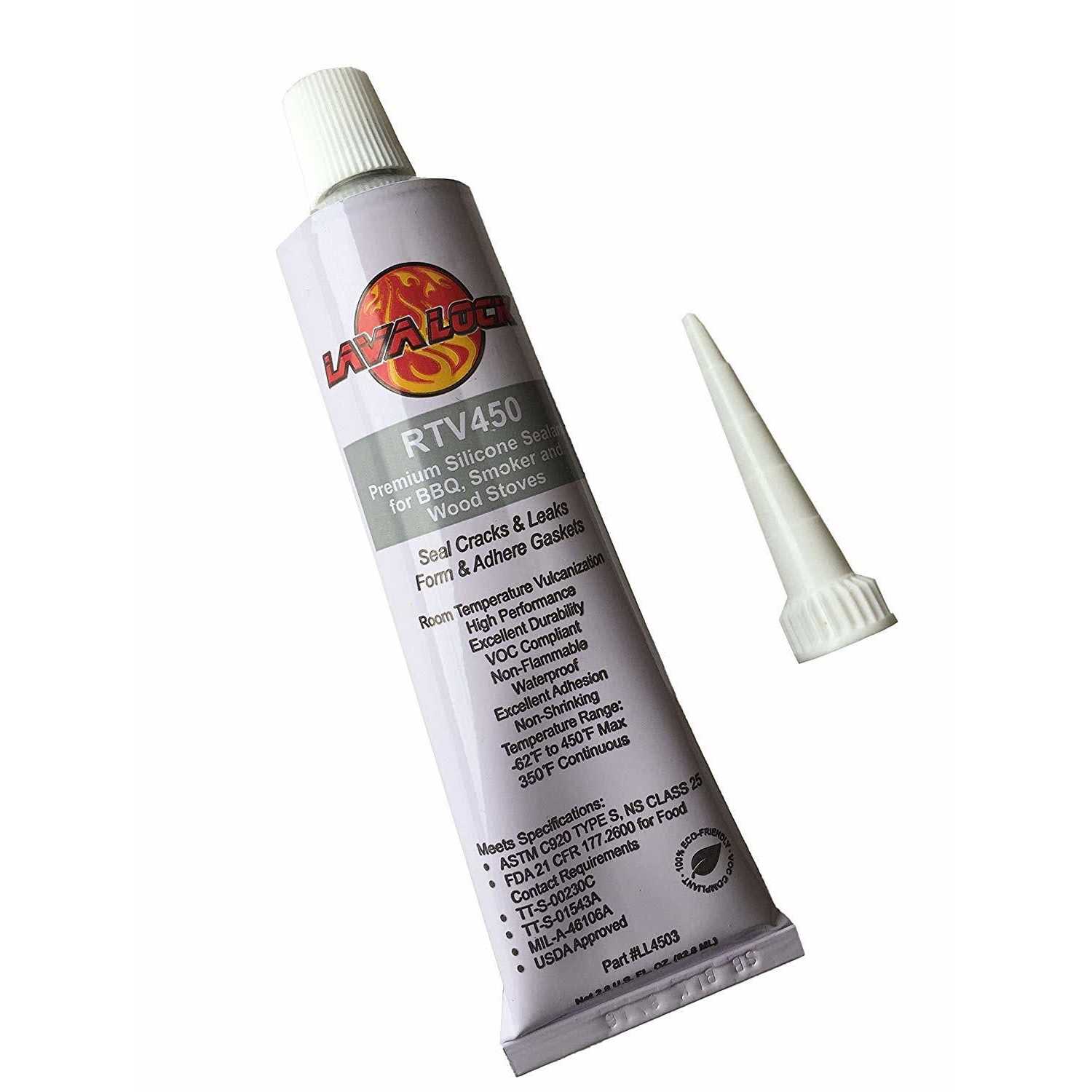 FDA Food Contact Safe High, temp BBQ smoker & wood stove sealer High Temp, Black color. Premium grade RTV adhesive Bonds to all gaskets and all surfaces. Easy to use, includes applicator tip LavaLock BLACK rtv Meets FDA specifications for Food contact requirements. 3 ounce tube (2.8 fl. ounce) Excellent bond, impervious to weather 450F max temp, 350F continuous. Super high tack. Self curing. LavaLock BBQ smoker High temp silicon is perfect for adhering gaskets, sealing smoker pit doors, lids, fire boxes, cook chambers and any other leaky bbq part. Our premium grade rtv sealer is meets FDA requirements for food contact BLACK color, self curing 450F max. 2.8 fl. ounce. 3 ounce tube. Includes applicator tip. Our best Black bbq sealer and gasket adhesive.
