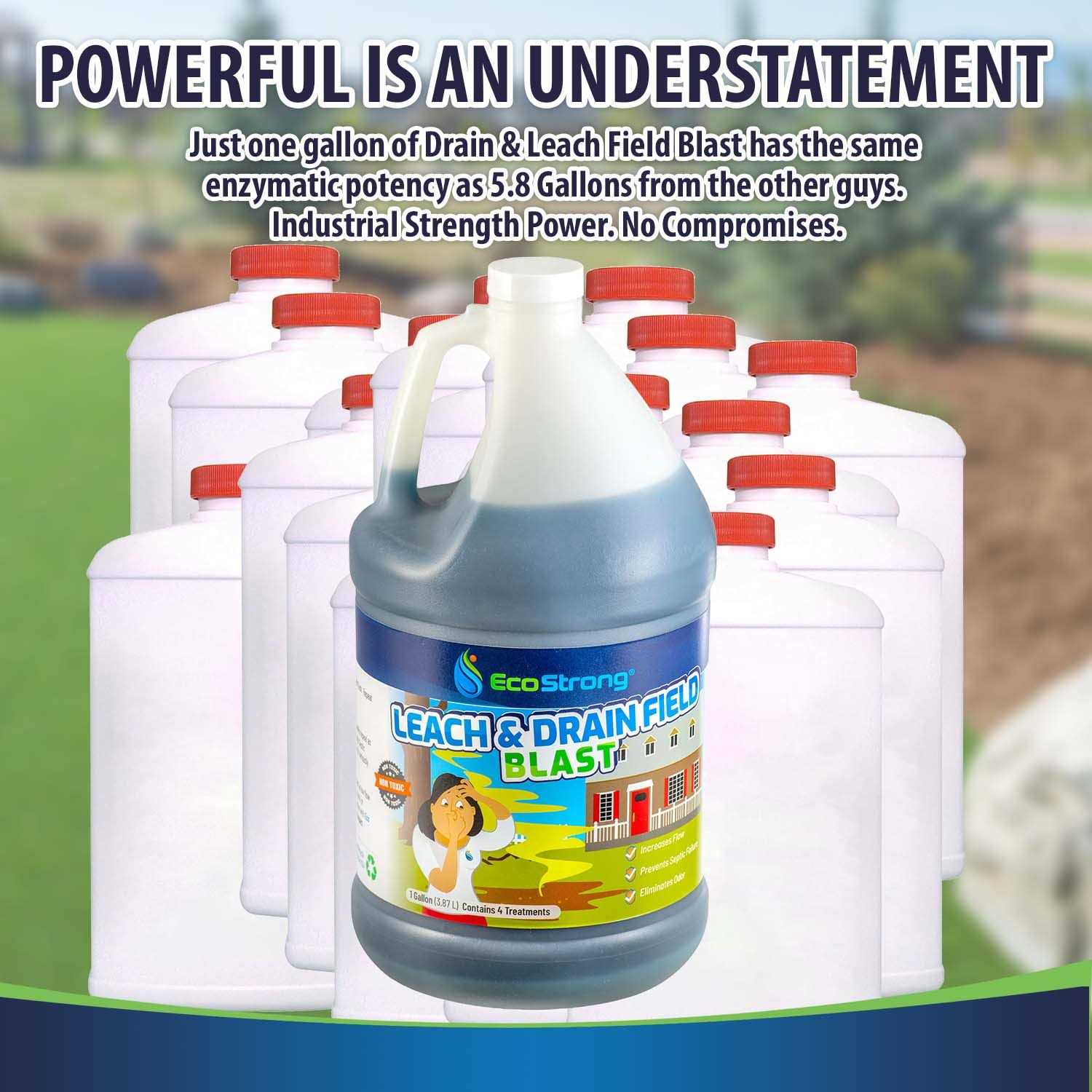 EcoStrongs Leach and Drain Field Blast increases flow and drainage in sluggish and/or clogged drain fields. It contains trillions of bio-enzymes that break down clog forming sludge, soap scum, paper, fats, grease, and more. Additionally the added enzymes will attack stubborn fouling bio-mats. Leach and Drain Field Blast also eliminates odors while working in harmony with the systems natural bacteria. Containing six times the amount of bio-enzymes as compared to the leading competitor Leach and Drain Field Blast will also reduce sludge increasing the time between pump outs.