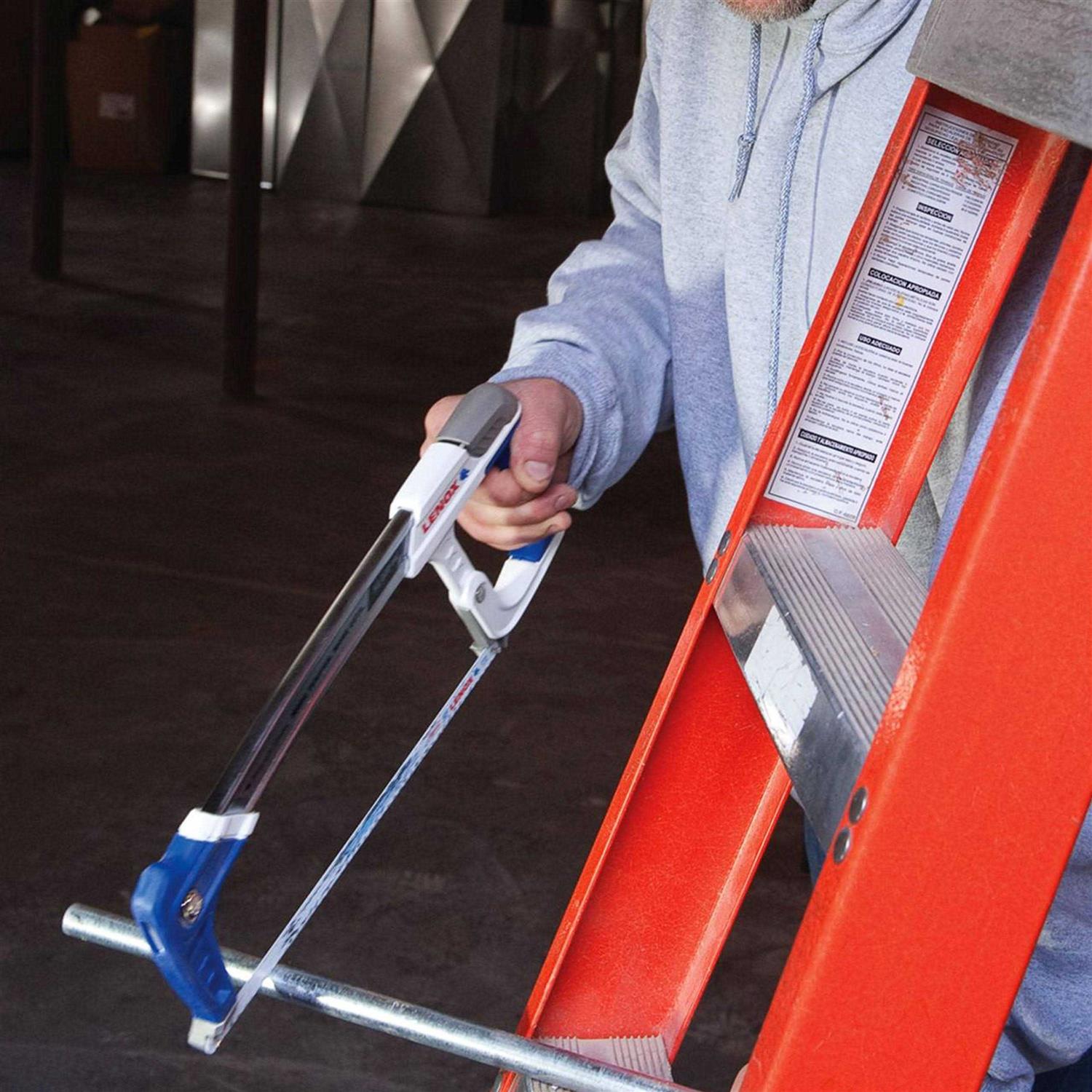 The Lenox high-tension hacksaw is designed for high-tension metal cutting in tight spots, delivering fast and straight cuts. Its exclusive I-beam design allows the blade to be tensioned up to 50,000 pounds per square inch, ensuring optimal cutting performance. The hacksaw features a multi-purpose mount blade at a 45-degree angle, making it perfect for flush cutting applications. The frame of the hacksaw is made of heavy-duty aluminum, providing a lightweight yet durable construction. The D-shaped handle is equipped with a rubberized grip, offering a firm hold and enabling comfortable use even in wet or cold environments. The hacksaw also features a tubular back for convenient storage of up to 5 spare blades, while the frame resists blade twisting and breakage. Additionally, it can convert any reciprocating saw blade into a jab saw for quick blade changes.