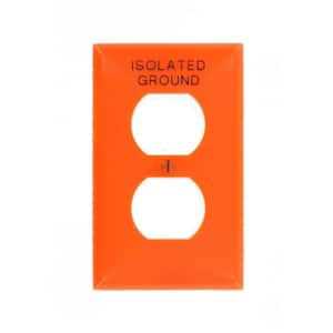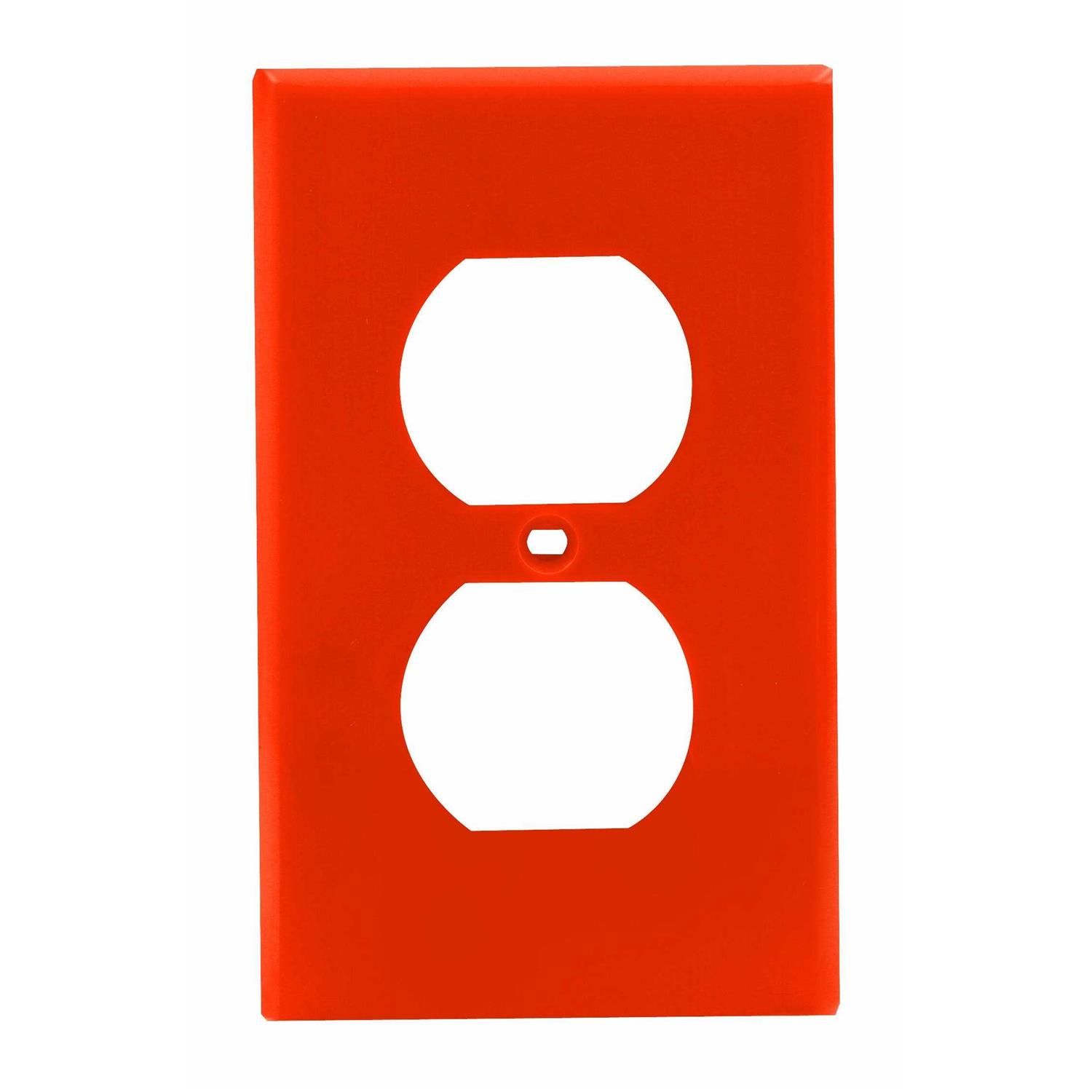 Leviton 1-Gang 1-Duplex Receptacle wallplate in orange color features a sturdy thermoplastic nylon construction for optimum resistance against impact, abrasion and fading. Standard-size wallplate measures 2.750 Inch x 4.500 Inch x 0.215 Inch. It comes with 1.343 Inch x 1.125 Inch cutout. Wallplate is resistant to high mechanical stress. Wallplate includes matching screws that are made of durable metal for easy mounting and suiting the decor. Wallplate has a smooth finish that can be easily cleaned. It is ideal for use in hospitals, institutions, industries or commercial purposes. Wallplate is non-combustible for added safety. It goes well with other traditional Leviton devices. Wallplate is UL listed/CSA certified.