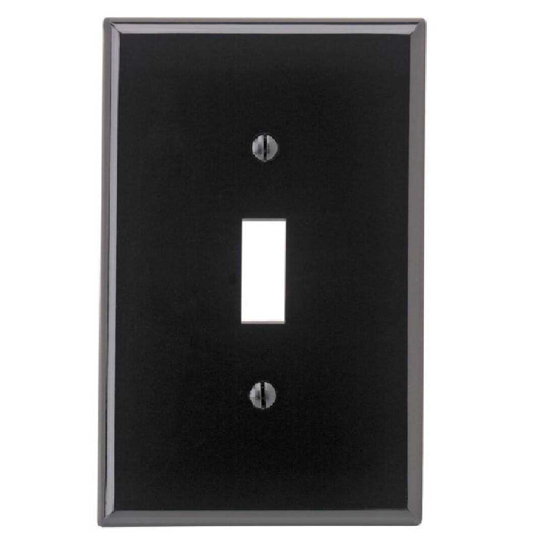Leviton 1-Gang Toggle switch wallplate in black color is made of thermoplastic nylon material for added durability. Wallplate is non-combustible and has a smooth finish with a stylish design construction to hide wall surface irregularities. Mid-size wallplate measures 3.125 Inch x 4.875 Inch x 0.255 Inch. It includes mounting screws to offer quick and easy installation. Wallplate is UL listed NEMA, ANSI and CSA certified.
