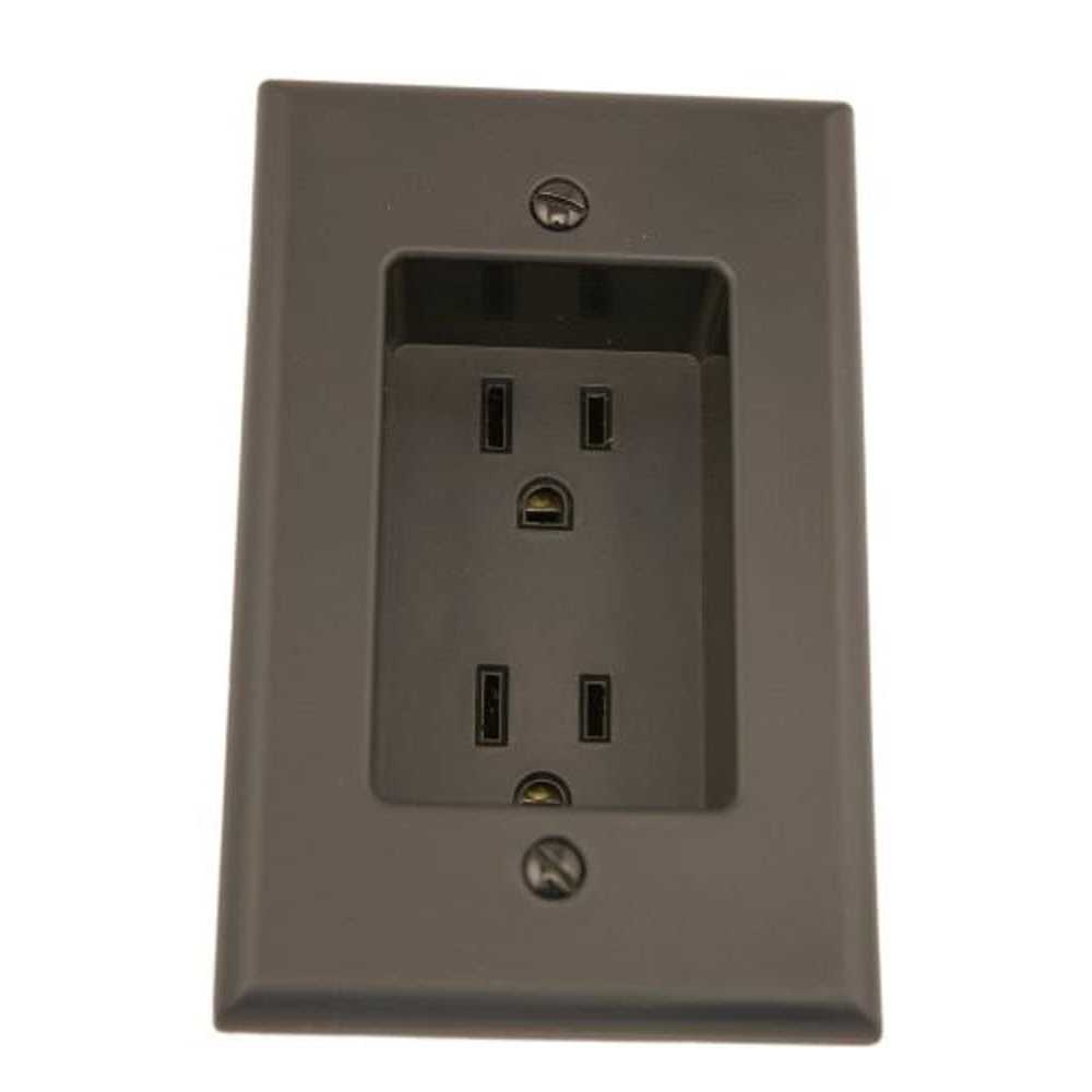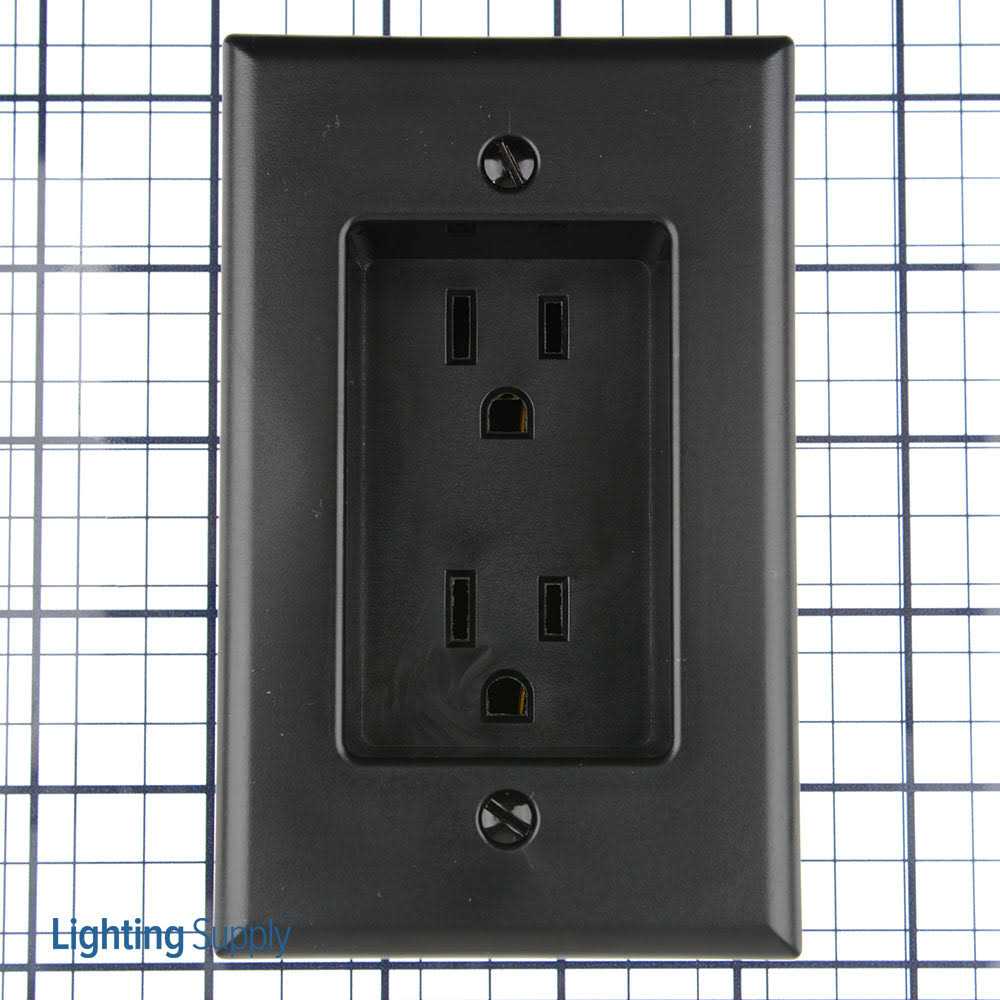 Leviton Decora 1-Gang 2-Pole 3-Wire Recessed duplex receptacle in black color, has current rating of 15-Amps and voltage rating of 125-Volts. Receptacle is ideal for use in homes, apartments, co-ops, condominiums and offices. This recessed duplex receptacle supports flush mounting for easy installation behind wall units, wall-mounted Flat Panel TVs and signature artwork. It fits most common electrical boxes and has NEMA 5-15R rating for added safety. Receptacle is cULus listed.