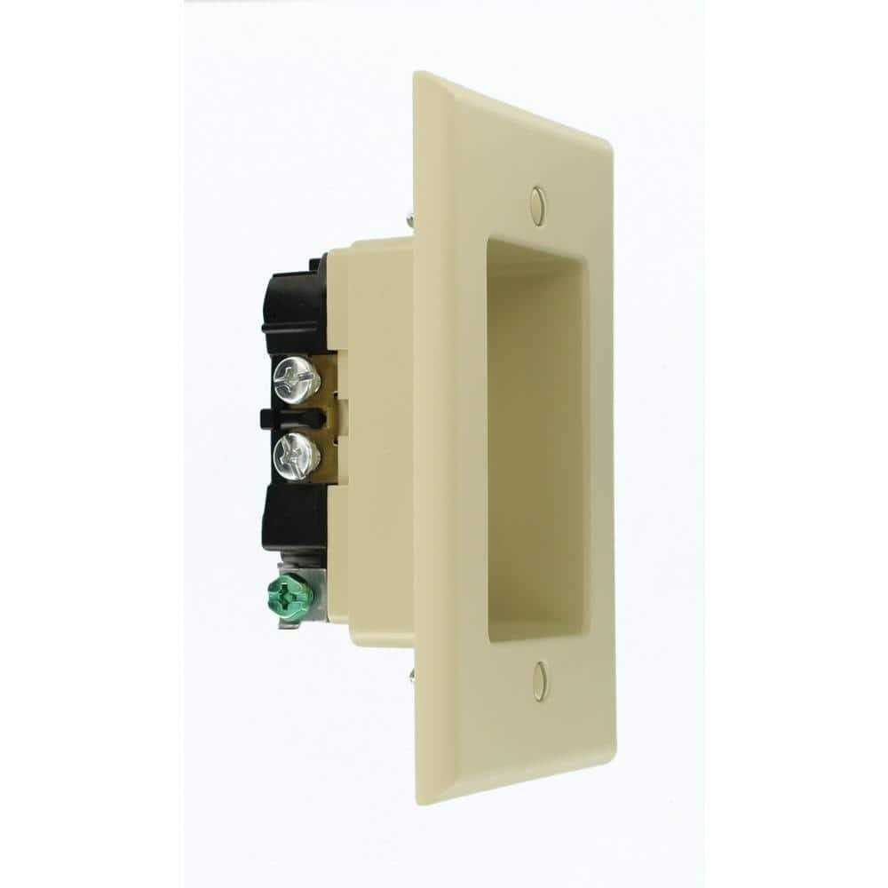 Leviton 2-Pole Recessed duplex receptacle in ivory color has durable thermoplastic face and body for low moisture absorption. The 1-Gang receptacle has durable steel strap to offer high tensile strength. It has three-wire circuitry, side wire termination and screw mount to housing for easy installation. It has current rating of 15 Amps and voltage rating of 125 Volts. It has flush-mounting option to install wall-mounted flat panel TVs, signature artwork and more invisibly behind the wall units.