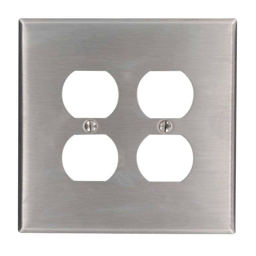 Leviton 2-Gang 2-Duplex Receptacle wallplate in silver color features a 430 stainless steel construction to offer resistance against corrosion. Oversized wallplate measures 5.310 Inch x 5.250 Inch x 0.187 Inch. Wallplate is used to conceal greater wall irregularities. It is used for residential and commercial purposes. Wallplate is UL listed/CSA certified.