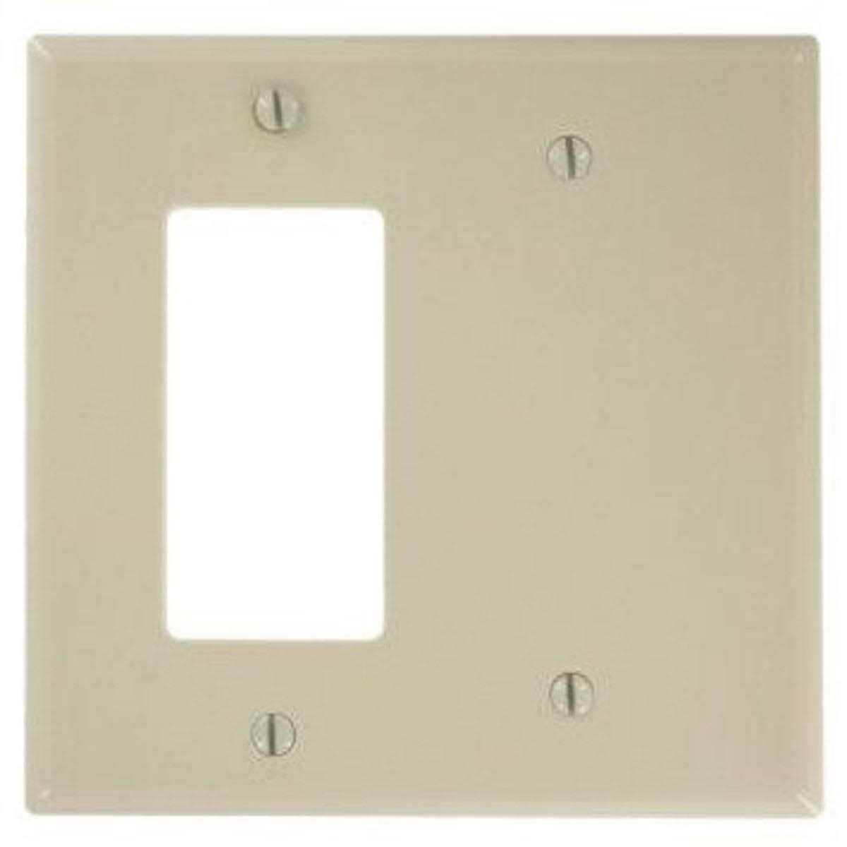 Leviton Decora 2-Gang Mid-size combination wallplate in ivory color measures 4.940 Inch x 4.875 Inch x 0.250 Inch. Wallplate is made of thermoset plastic and has a smooth finish for maximum resistance against impact, abrasion, fading/discoloration. The 1-blank wallplate comes with a cutout of size 0.406 Inch x 0.942 Inch and features smooth face/rounded edges that resist dust accumulation making it easy to clean. It is strap mountable and can be mounted on to larger volume outlet boxes or used to hide wall irregularities. The 1-Decora/GFCI wallplate finds application in residential/commercial purposes. Wallplate is UL listed/CSA certified.