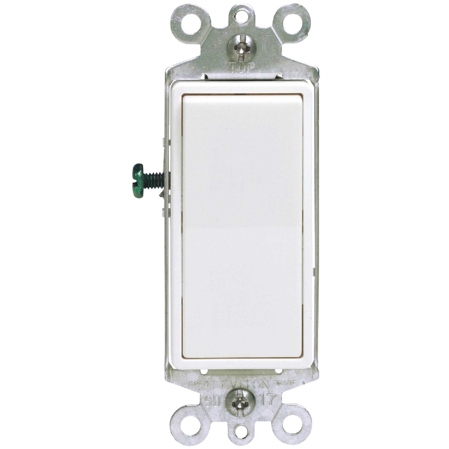 Leviton Decora 15 Amp White Rocker Grounded 3-Way Switch is ideal for controlling one fixture from two locations. With both quickwire push-in and side wiring options, it is fast and easy to install. This switch is constructed from durable, impact resistant thermoplastic to withstand damage and last longer. It is compatible with Leviton wallplates and the diverse white color goes well in any room. The terminal screws accept up to No. 10 copper wire.