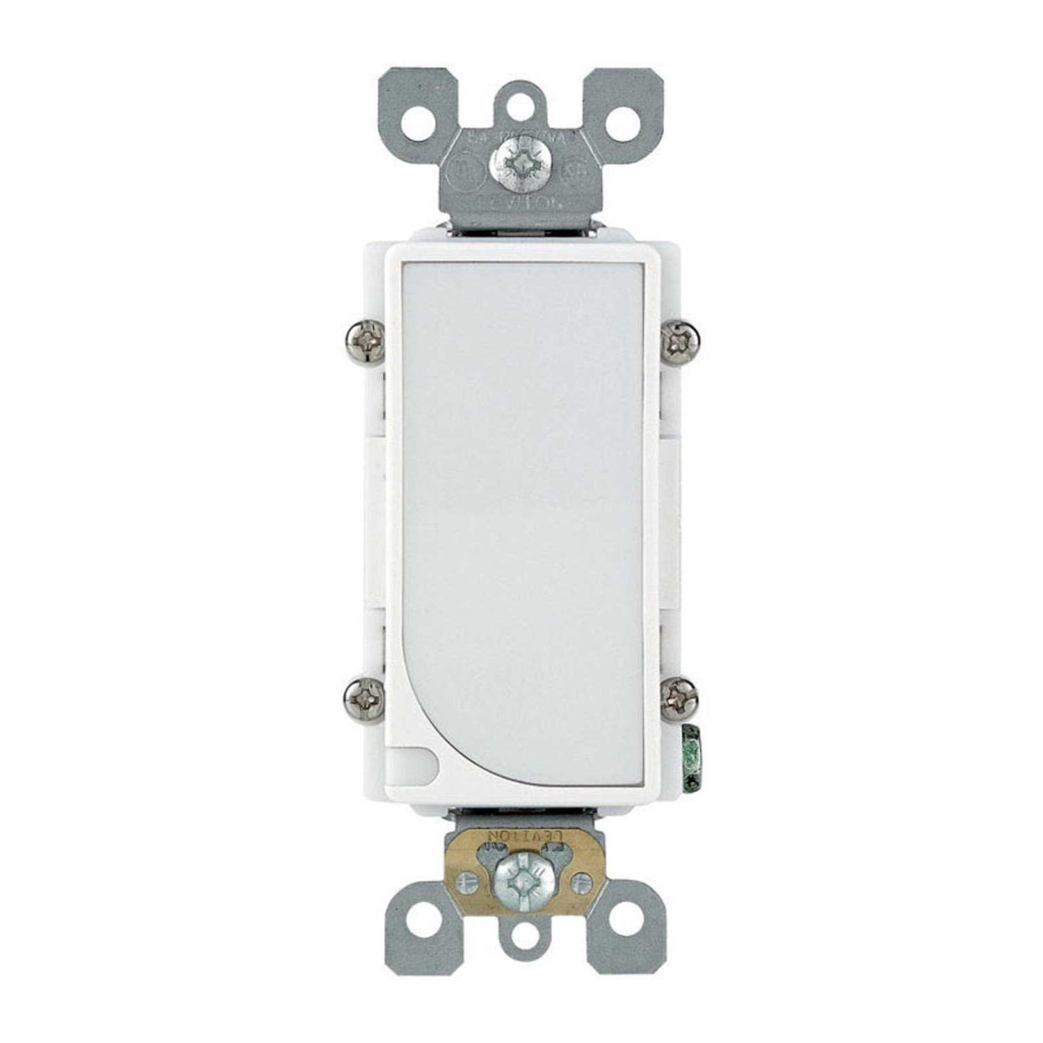 Leviton Decora Combination switch in white color features Impact-resistant face and body for durability/protection. It is rated at 3.7 milli-Amps, 1 Watt, 120 VAC and 60 Hz. Switch features sensor LEDs that turns on and off automatically in switch/guide light and has 6-Inch distance to light. It is ideal for residential use, hallways or stairways. Switch has wallbox mounting for convenient installation and temperature rating of -40 to 120 deg C. It comes with four lix light output. Grounding switch is has back/side wired connection and is rated at NEMA 5-15R. Switch is UL listed and CSA certified.