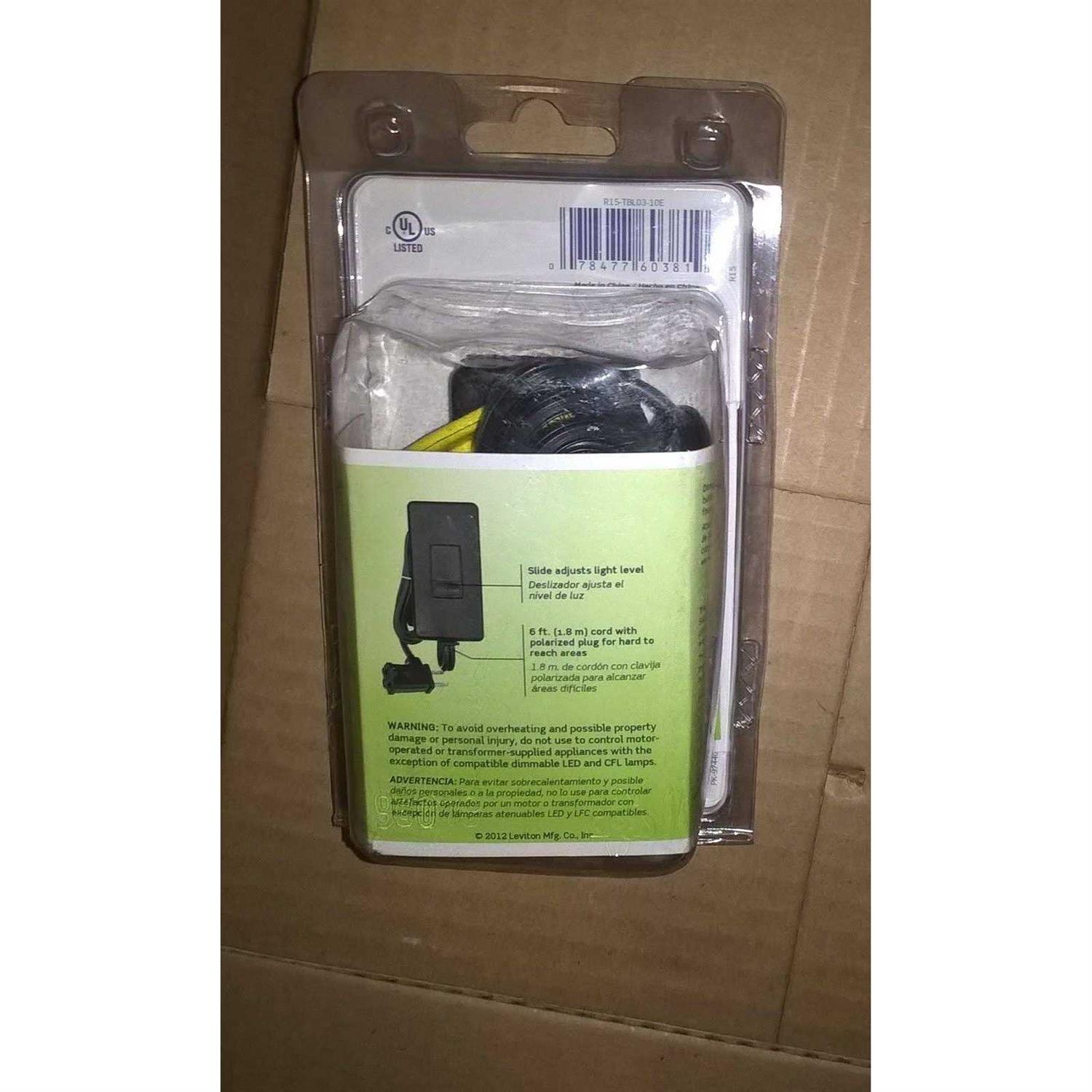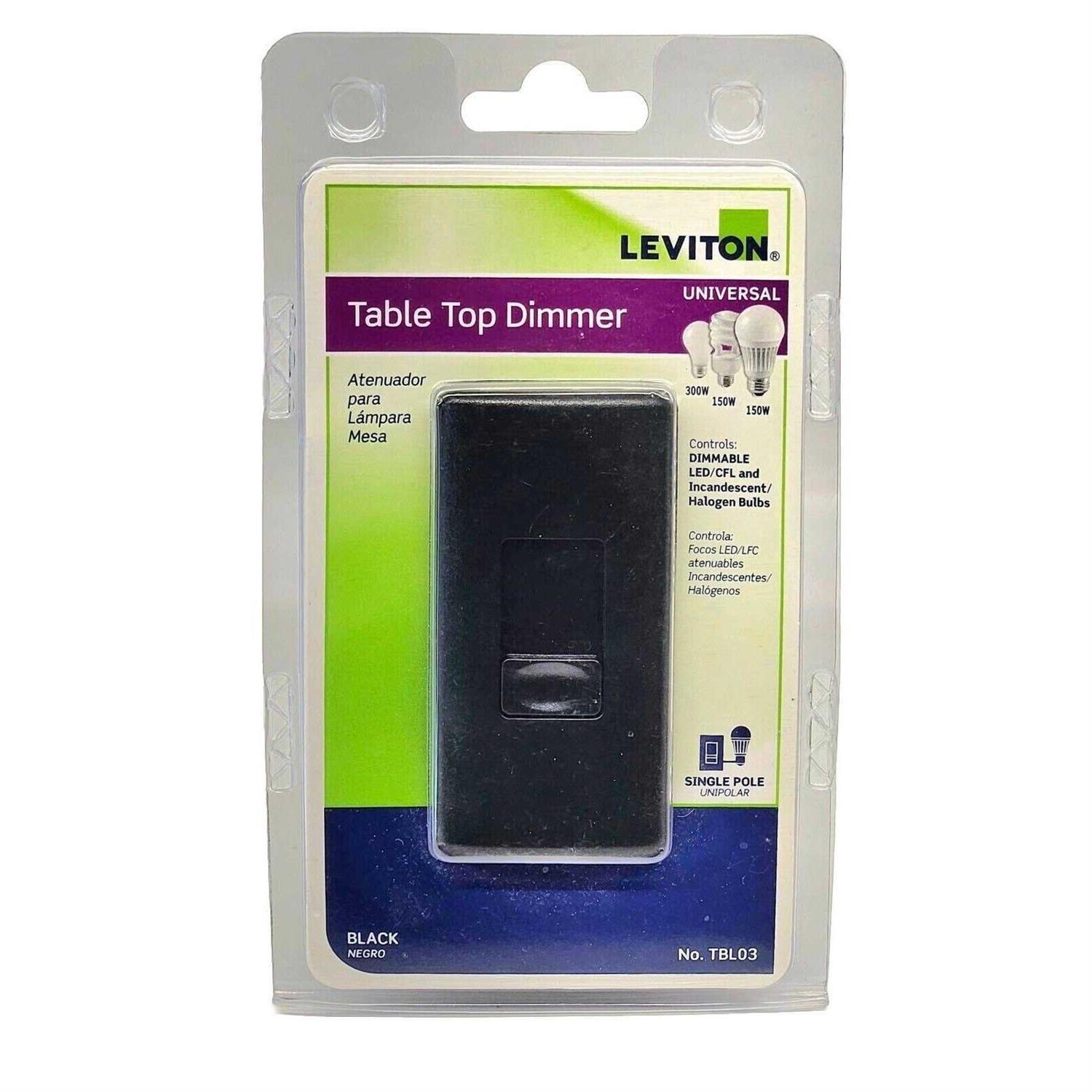 Universal Tabletop Dimmer, 300W Incandescent Rating, 150W LED and CFL Rating, 120 Volt AC 60Hz, 6ft Polarized Cord – Color Black Leviton offers many products that will help lower electrical costs and add convenience to everyday living. Dimmers reduce energy consumption and extend bulb life. Leviton’s table top dimmer is an easy way to add the ambiance of dimming to a table or floor lamp, Just plug in lamp and start dimming.