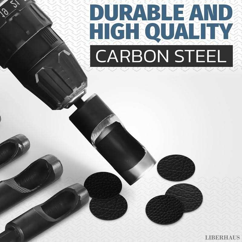 Description: Hollow punch set for use with a power drill or drill press Get precision holes in leather or heavy, thick fabrics with this amazing hollow punch set! The hollow punch set features hex shanks for a secure, non-slip fit in any chuck. These hollow punches are ideal for do-it-yourselfers, professional leatherworkers and a variety of other applications! Hex shanks for secure, non-slip fit in any chuck Precision holes in leather or heavy fabric Punches holes in leather, rubber, canvas, cardboard, plastic and other soft materials Specification: Diameter 3/16 in., 1/4 in., 5/16 in., 3/8 in., 7/16 in., 1/2 in. Number of pieces included 6 Product Length 1 in. Product Weight 0.36 lbs. Size(s) 2-3/4 in.