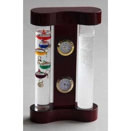 Our elegant Galileo Weather Station combines a Galileo Thermometer and storm glass with a precision quartz clock, and hygrometer, all housed in an elegant solid wood holder with a rich mahogany finish. Weather buffs can create their own forecasts and track daily trends with these quality instruments, then watch the temperature floaters float up and down the glass tube to determine the current temperature. Galileo thermometer showing temperatures of 64 to 80 degrees. Compact size fits on narrow surfaces like shelves, desks or bedside tables. Measures 5 inch tall x 4.25 wide x 1.5 deep. Lilys Home offers beautifully designed clocks, dishware, garden decorations, and more to add a touch of style to any home. Whether youre looking for a statement piece for your living room or looking for a way to add more color to your garden, Lilys Home has just what youre looking for!