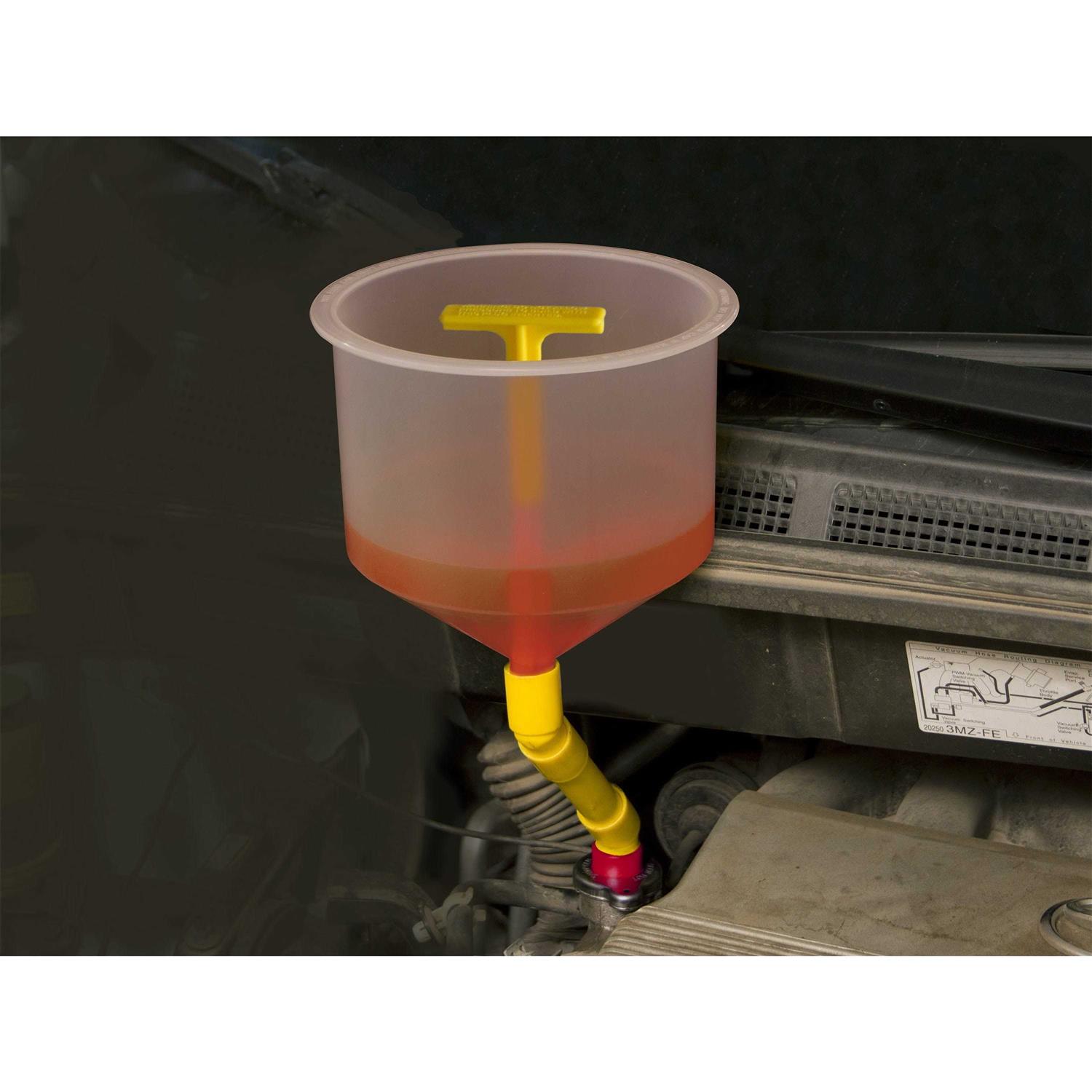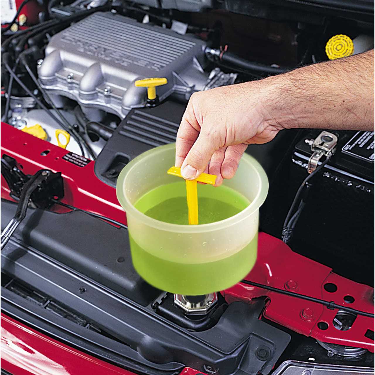 Comes with a lid to keep contaminants out as well as store the caps and adapters. Eliminates trapped air pockets which usually cause erratic cooling system and heater performance. t controls the proper amount of coolant entering system and enables unattended filling of the cooling system. The funnel eliminates squeaky belts caused by coolant overflow and protects the environment. Five different colored radiator adapters and six caps to fit most cars pickups trucks and many farm tractors. Two straight extensions and two 45 elbows for angled and hard-to-reach applications. Comes with a lid to keep contaminants out as well as store the caps and adapters. Eliminates trapped air pockets which usually cause erratic cooling system and heater performance. It controls the proper amount of coolant entering system and enables unattended filling of the cooling system. The funnel eliminates squeaky belts caused by coolant overflow and protects the environment. Five different colored radiator adapters and six caps to fit most cars pickups trucks and many farm tractors. Two straight extensions and two 45#176; elbows for angled and hard-to-reach applications.