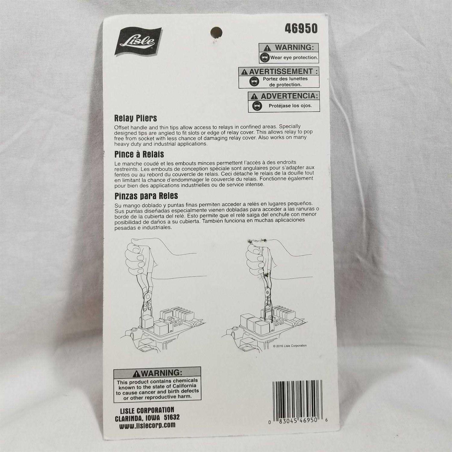 Lisle Lisle 46950 Relay Puller Pliers Offset handle and thin tips allow access to relays in confined areas.Specially designed tips are angled to fit slots or edge of relay cover. This allows relay to pop free from socket with less chance of damaging the relay. Also works on many heavy-duty and industrial applications.