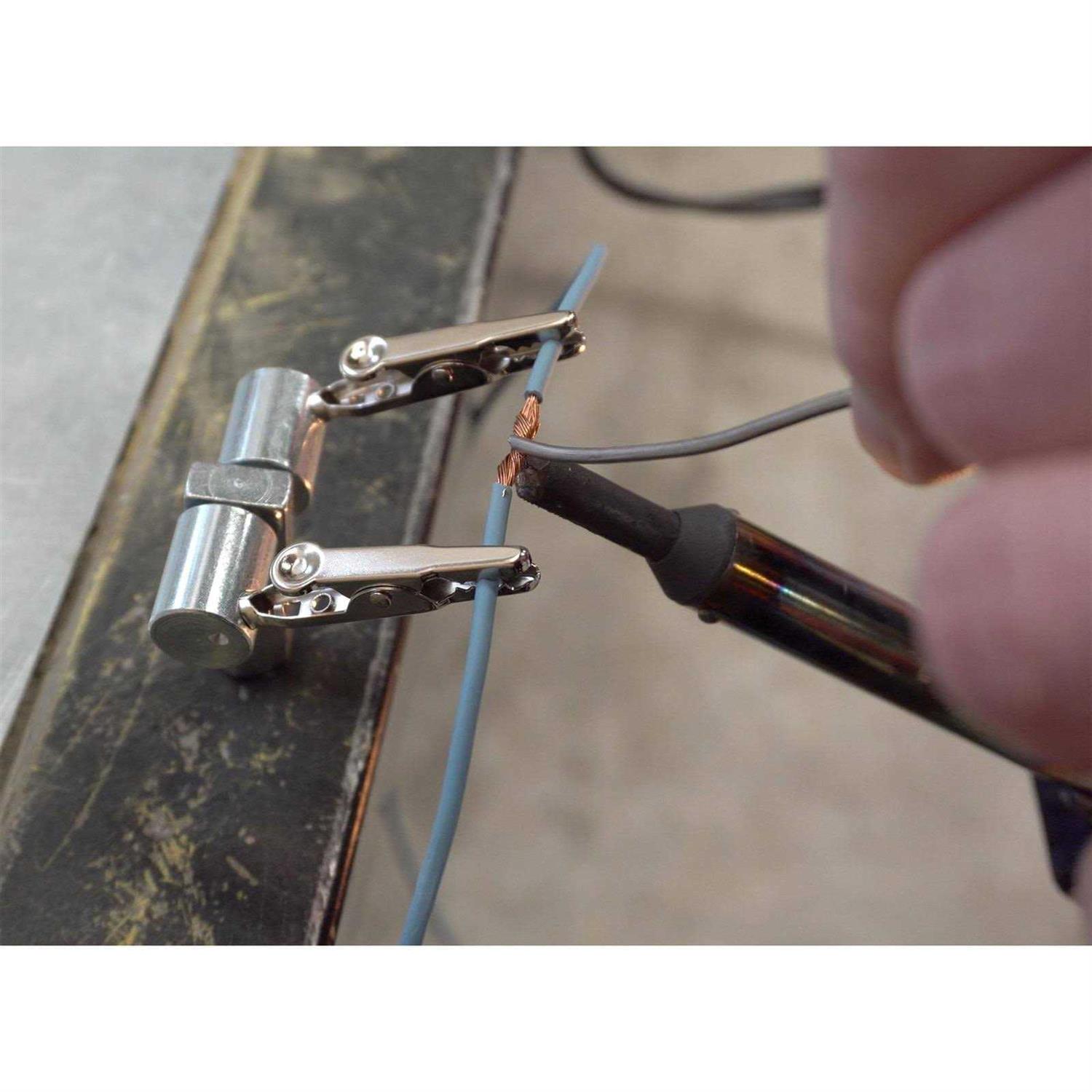 Features and Benefits: Clamps firmly hold wire and small parts Clips and base are magnetic Arms are magnetic and can be removed and used without the base Base is hex shape to fit in a vise Offers an extra pair of hands when soldering. Alligator clamps firmly hold wire and small parts when soldering. Flexible design allows different ways to attach and hold wire. Clips and base are magnetic and can be attached to any ferrous surface.