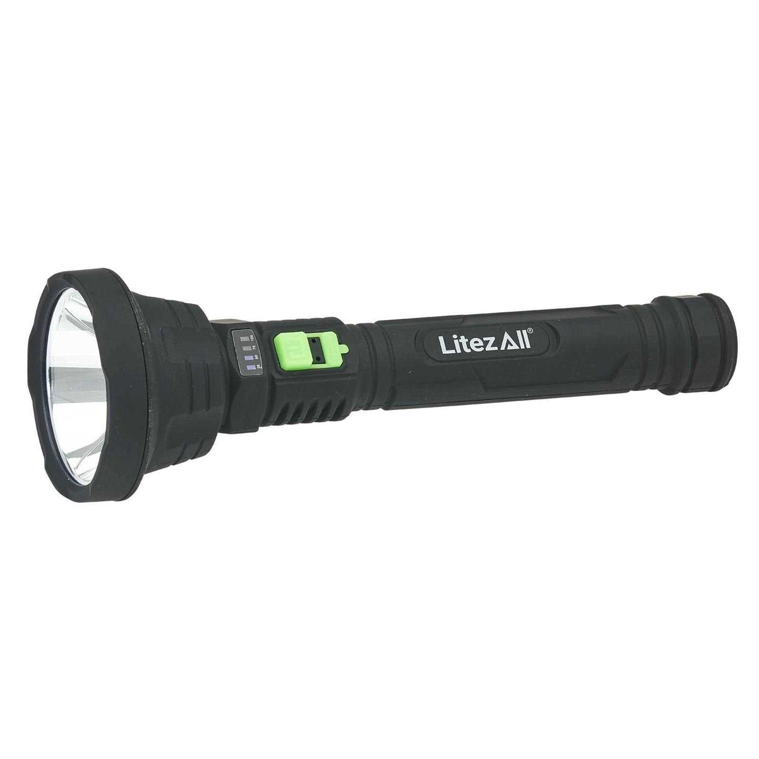 The LitezAll ULTAC2 is a powerful, rechargeable COB LED flashlight. It packs a powerful 1000 lumens light beam produces a focused narrow beam combined with a wide beam making is optimal for any situation. The light features 3 brightness modes and is 5x more lightweight compared to standard high lumen output flashlights. The durable ABS Plastic & TPR coating is comfortable to hold for extended periods. The LitezAll ULTAC2 may be charged from any USB power source including computers, power cubes, power banks and car chargers. A charging cable is included. The built-in battery indicator shows charging progress while charging and battery life while using the flashlight.