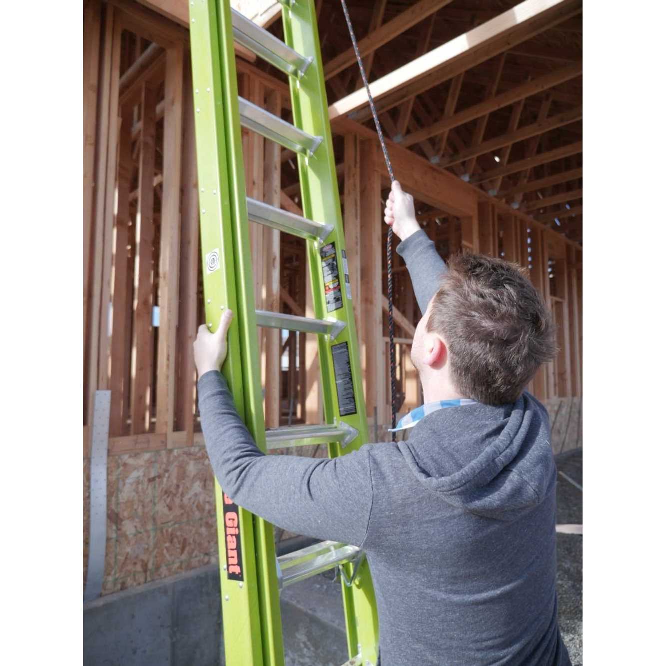 The Little Giant 28 ft Fiberglass Extension Ladder is a lightweight and sturdy tool for all your outdoor projects. It will support up to 300 lbs, making it a perfect choice for household tasks. The open height of the ladder is 14 ft 9 in., while its closed height is 14 ft 9 in. This ladder has an extended length of 28 ft, making it ideal for use with high ceilings or roof access. Its load capacity of 300 lb makes it a great option for household chores such as changing light bulbs and hanging holiday decorations. This extension ladder features non conductive rails, which provide safety when working around electrical wires. The Little Giant Fiberglass Extension Ladder will meet all your needs when you need to work at heights.