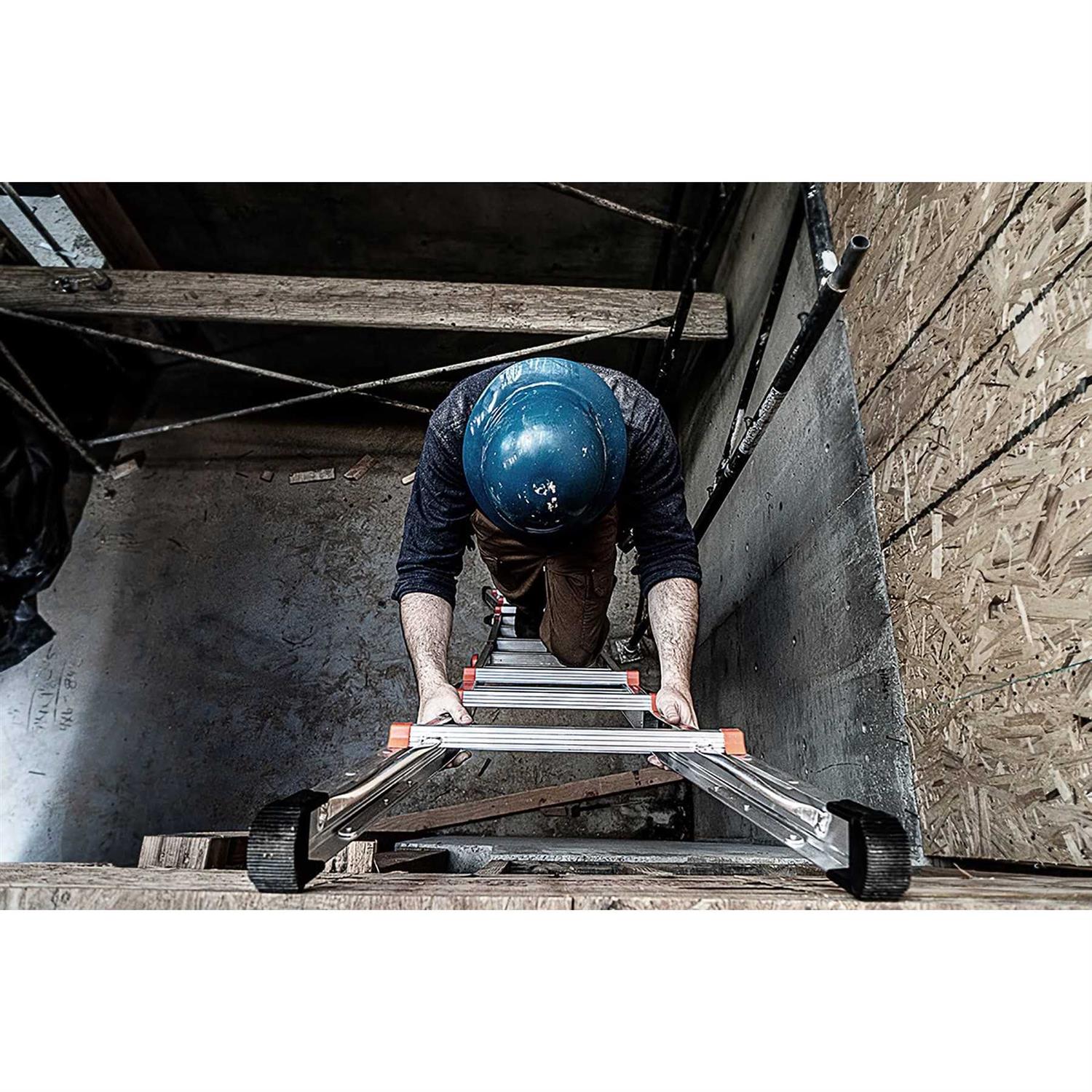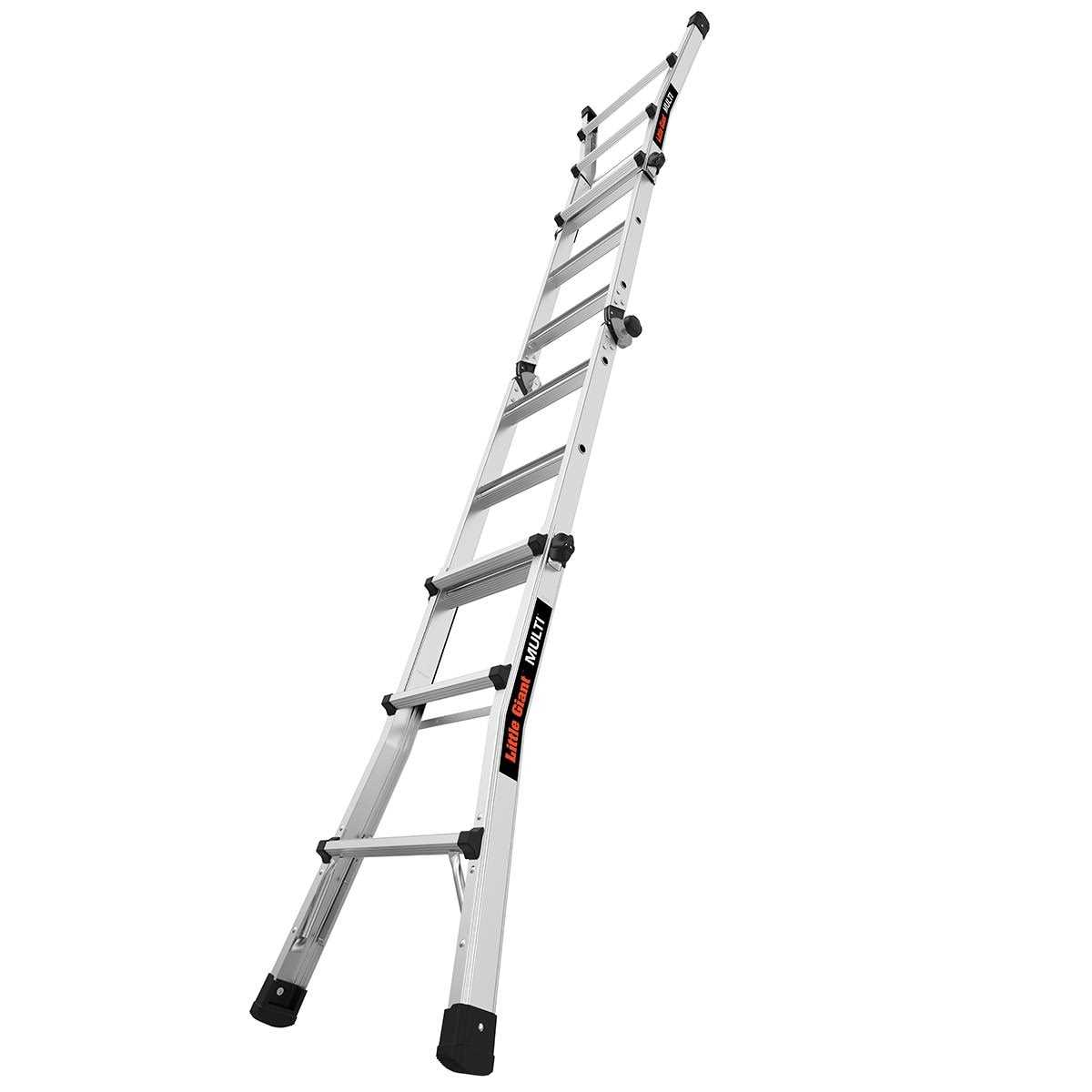 Maximum reach of 14 feet 4 inches in extension ladder position assuming a 5 ft 6 inch person with a vertical 12 inch reach. Multiple configurations including A-frame extension staircase or 90 ladder and trestle-and-plank scaffolding system. Features Little Giants new spring-assisted Rapid Lock adjustments which are easier to adjust than manual U-locks. The wide-flared legs and aerospace-grade aluminum construction provide unmatched safety and stability. Type IA ladder is designed for extra heavy-duty use supporting up to 300-lbs on each side. ANSI OSHA certified.