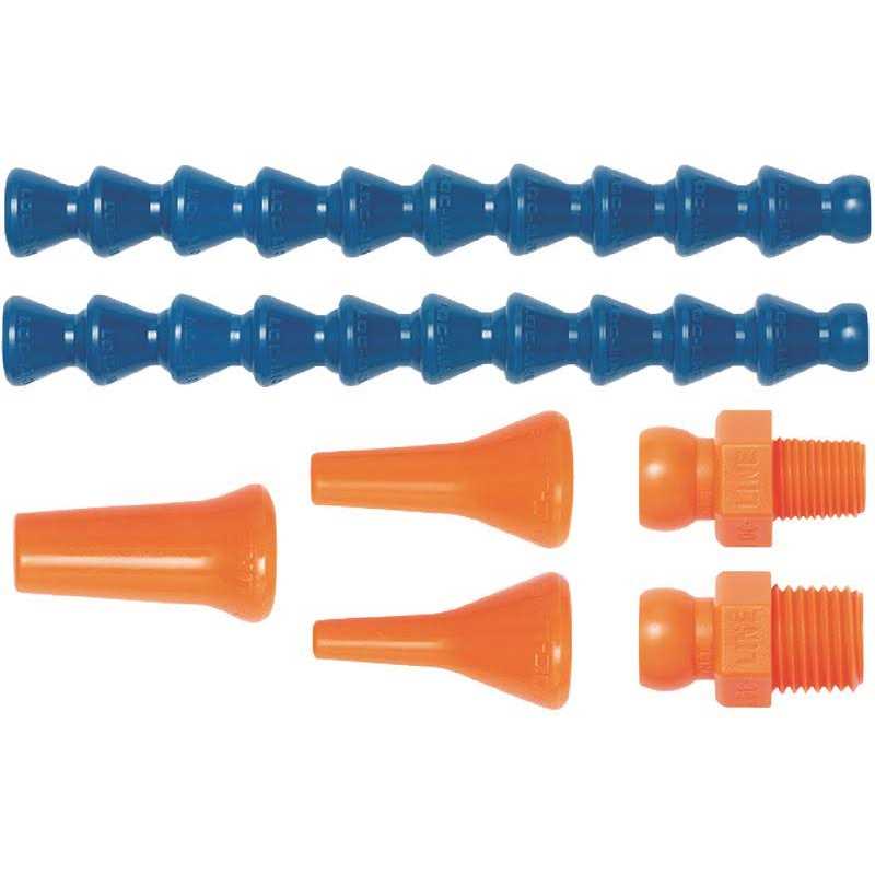 LOC-LINE Coolant hose system 1/4″, 40413/ Nipple,nozzles,joint pce. Type 1/4″ – 6 mm passage (15 l/min); segment outside diameter 12.5 mm or 16 mm. Coolant hoses can be put together, adapted, extended and shortened easily by hand; neither coolant pressure nor machine vibrations can change the hose”s position. Flat nozzles 41489, 49456 – ideal when sanding and for EDM applications.
